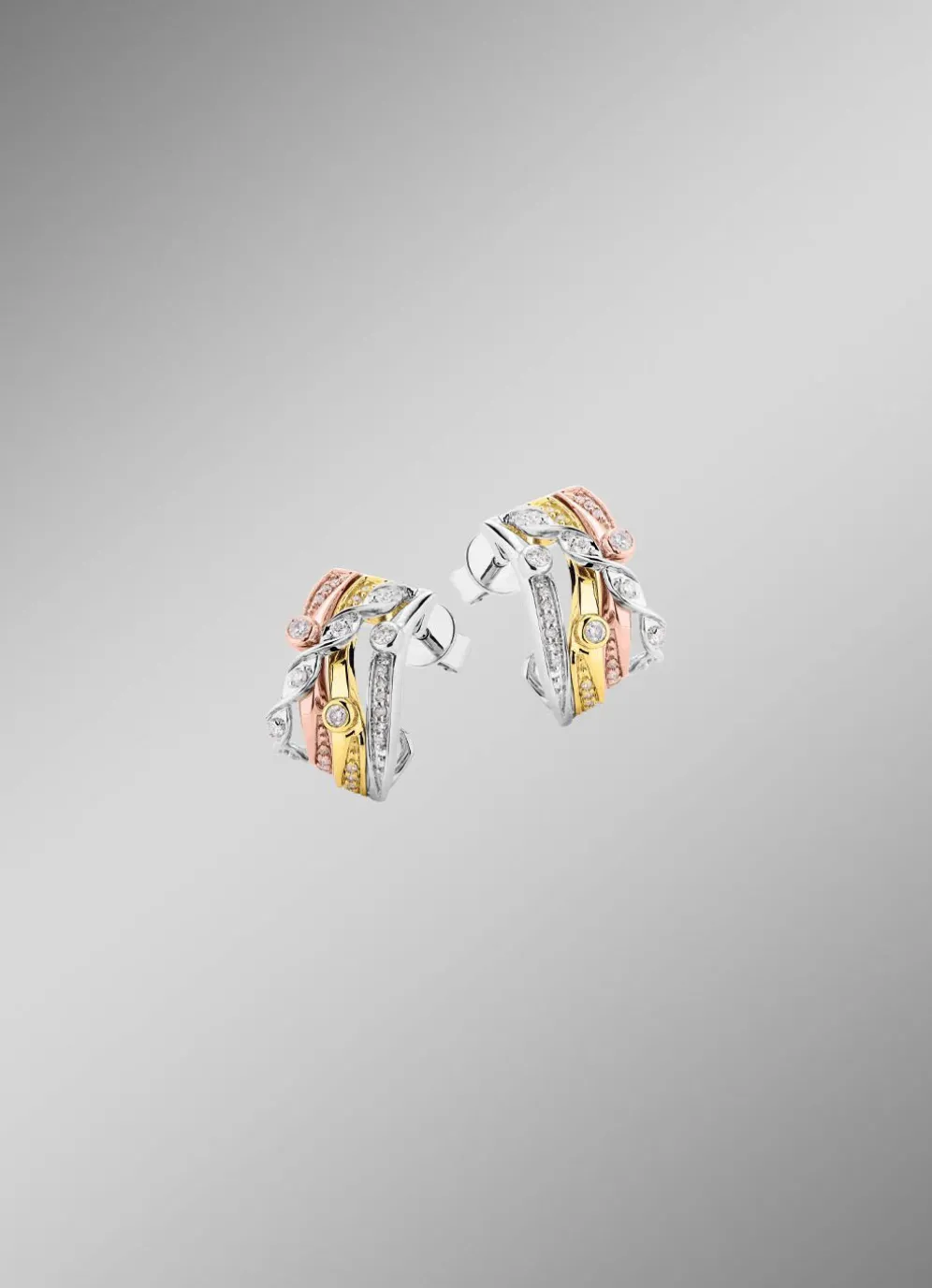 Diese exquisiten Ohrstecker aus Gold 375/- fein vereinen die Schönheit der Tricolor-Optik mit funkelnder Brillanz. Das Zusammenspiel aus warmen, rosigen und kühlen Goldtönen schafft eine harmonische, moderne Ausstrahlung, die jedes Outfit veredelt.