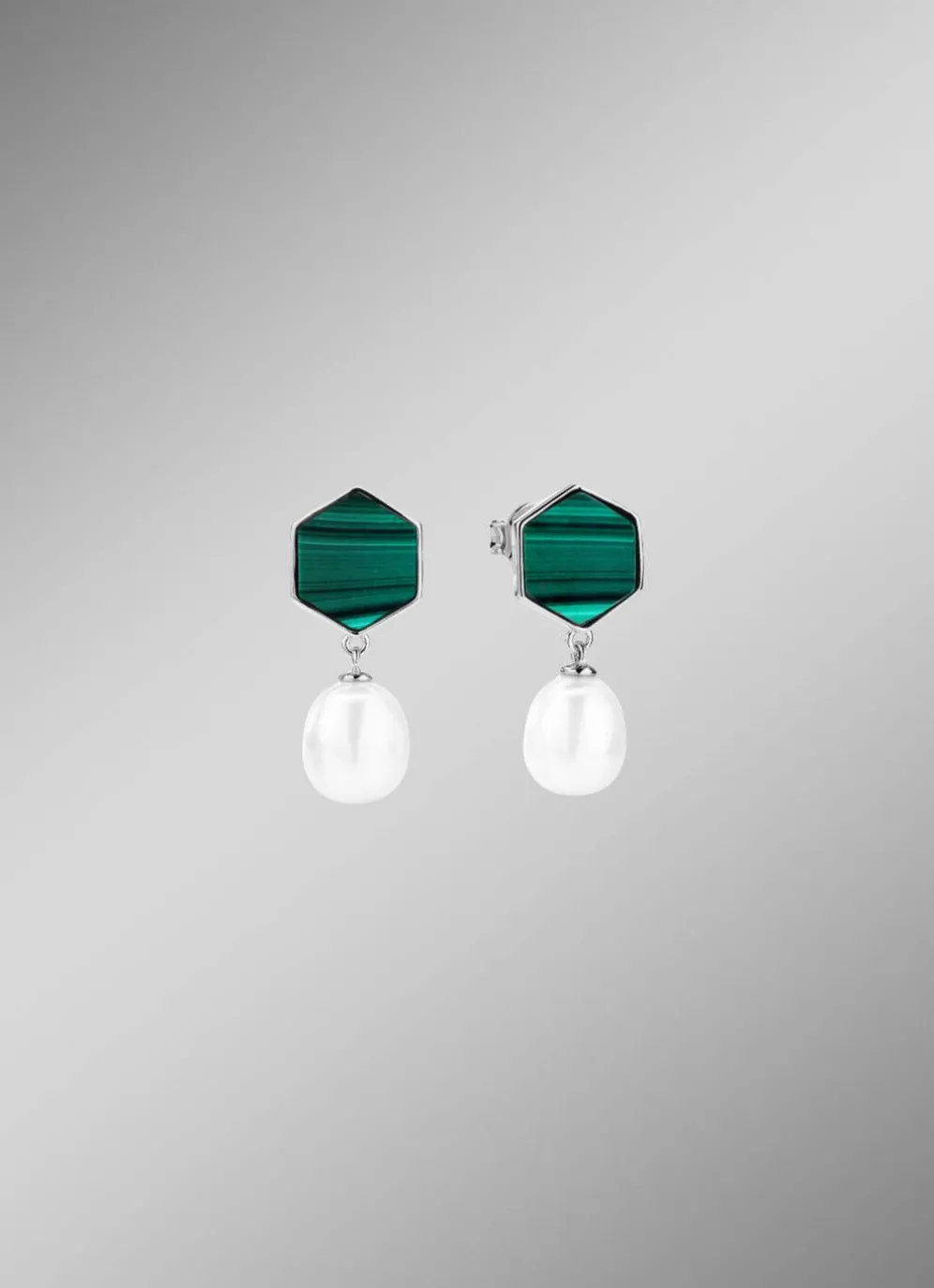 Für einen modernen, farbintensiven Akzent sorgt echter Malachit, dessen charakteristische grüne Maserung jedem Paar eine individuelle Note verleiht. Das Zusammenspiel aus zarter Perle und lebendigem Malachit schafft einen besonderen Kontrast, der sowohl elegant als auch ausdrucksstark wirkt.