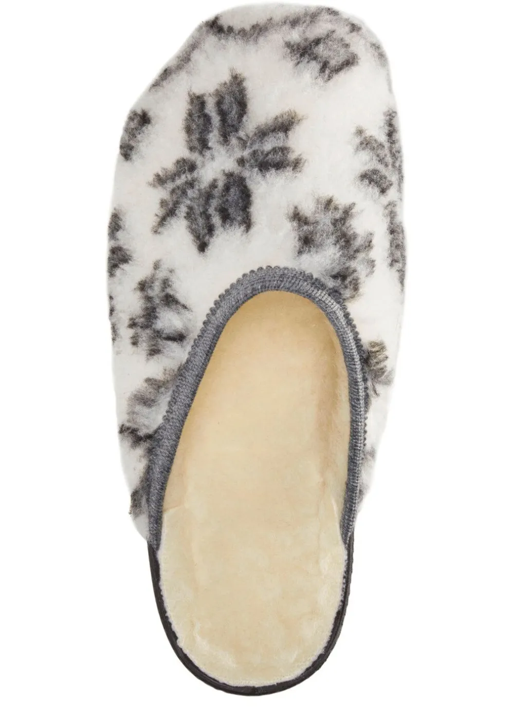 Pantoffel aus bedrucktem Plüschmaterial: Warmfutter und Fußbettbezug aus 100% Schurwolle, PVC-Laufsohle sowie 20 mm Keilabsatz
