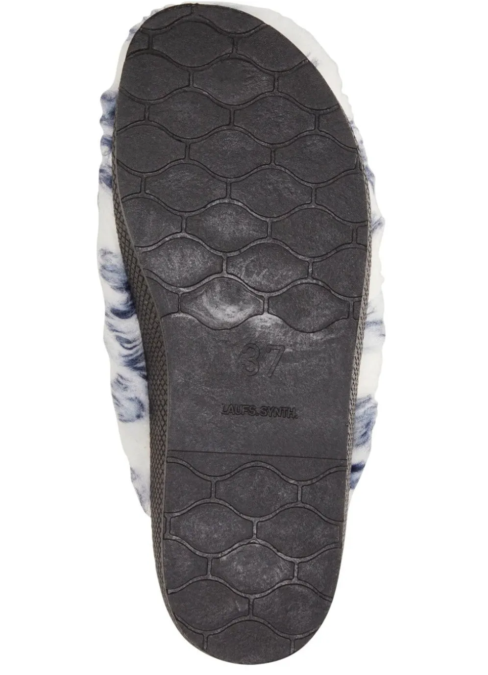 Pantoffel aus bedrucktem Plüschmaterial: Warmfutter und Fußbettbezug aus 100% Schurwolle, PVC-Laufsohle sowie 20 mm Keilabsatz