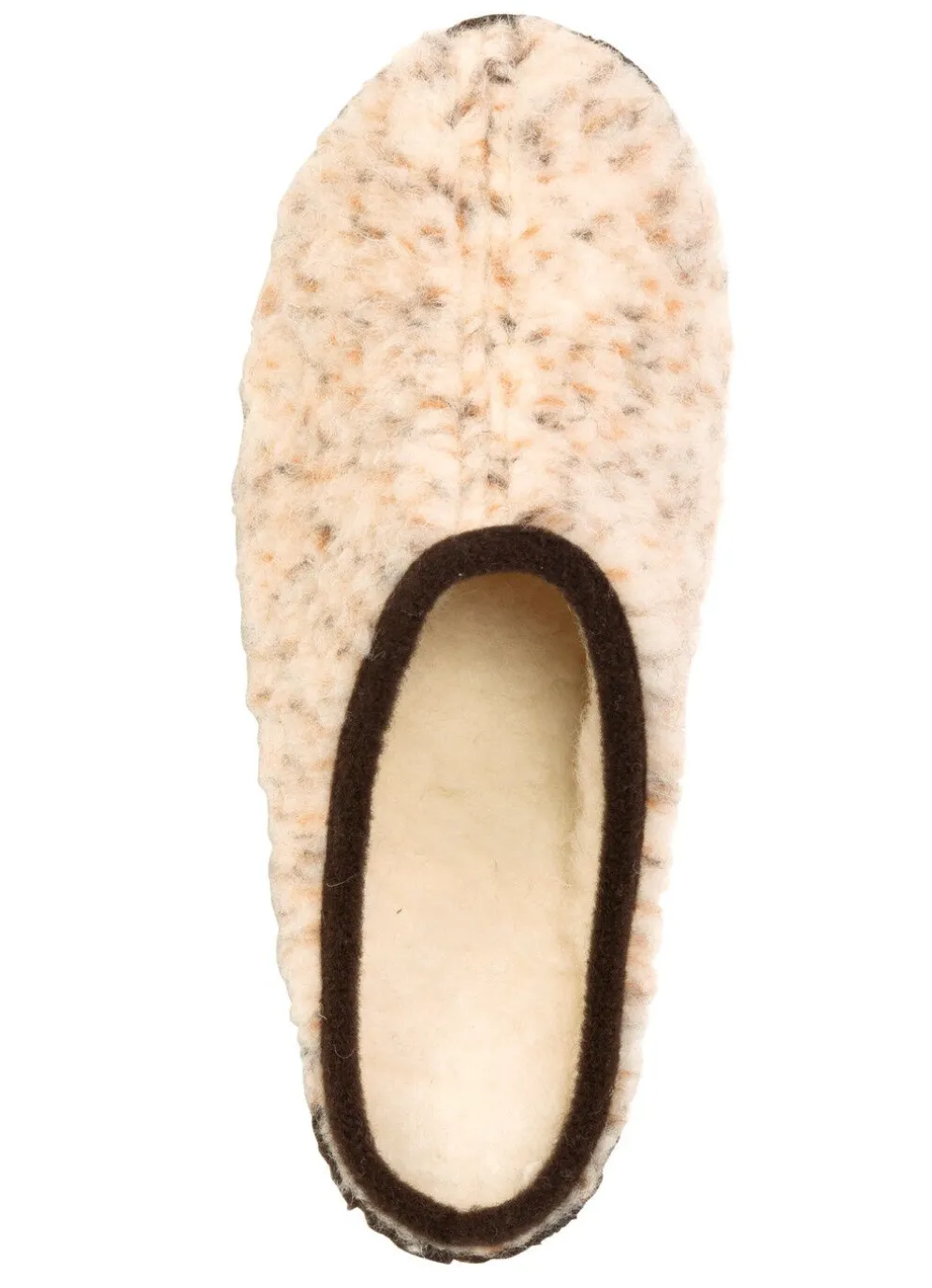 Gemütlicher Pantoffel aus gesprenkeltem Wollplüsch in Beige-Braun: Warmfutter und Fußbettbezug aus 100% Schurwolle, Fersenluftpolster, Filzschalensohle, TR-Laufsohle sowie 25 mm Keilabsatz