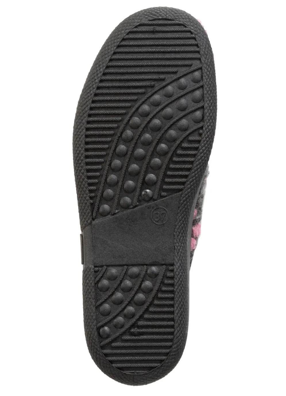 Pantoffel aus weichem Filzmaterial mit Blüten-Dessin: Weite H, Warmfutter und Fußbettbezug aus reiner Schurwolle, leichte PVC-Riffelsohle, 15 mm Keilabsatz