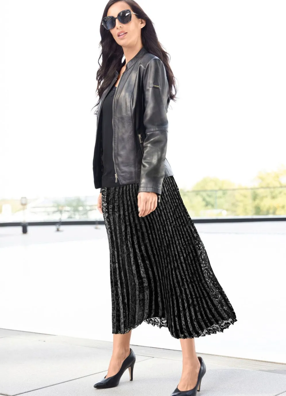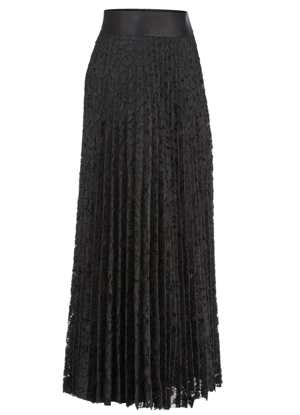 Exzellenter, schwarzer Sonnen-Plissee-Rock von TIZIA in floraler Spitze: Schlupfform, mit formstabilem Dehnbund rundum. Blickdicht unterlegt mit dezent schimmerndem Jersey. Gesamtlänge ca. 85 cm, bei K-Gr. ab ca. 78cm.