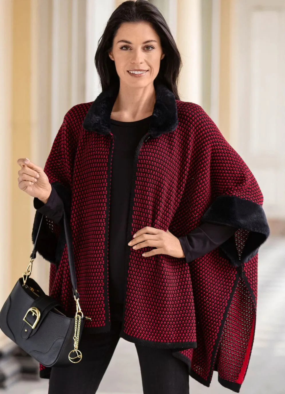 Ein Lieblingsstück mit viel Raffinesse ist dieser schwarz-rote Poncho mit Kunstpelz-Kragen, 1-Knopfverschluss, Strukturstrick allover, Kunstpelz-Besatz an den Armausschnitten sowie Kontrastabschlüssen an den fixierten offenen Seiten und am Saum.