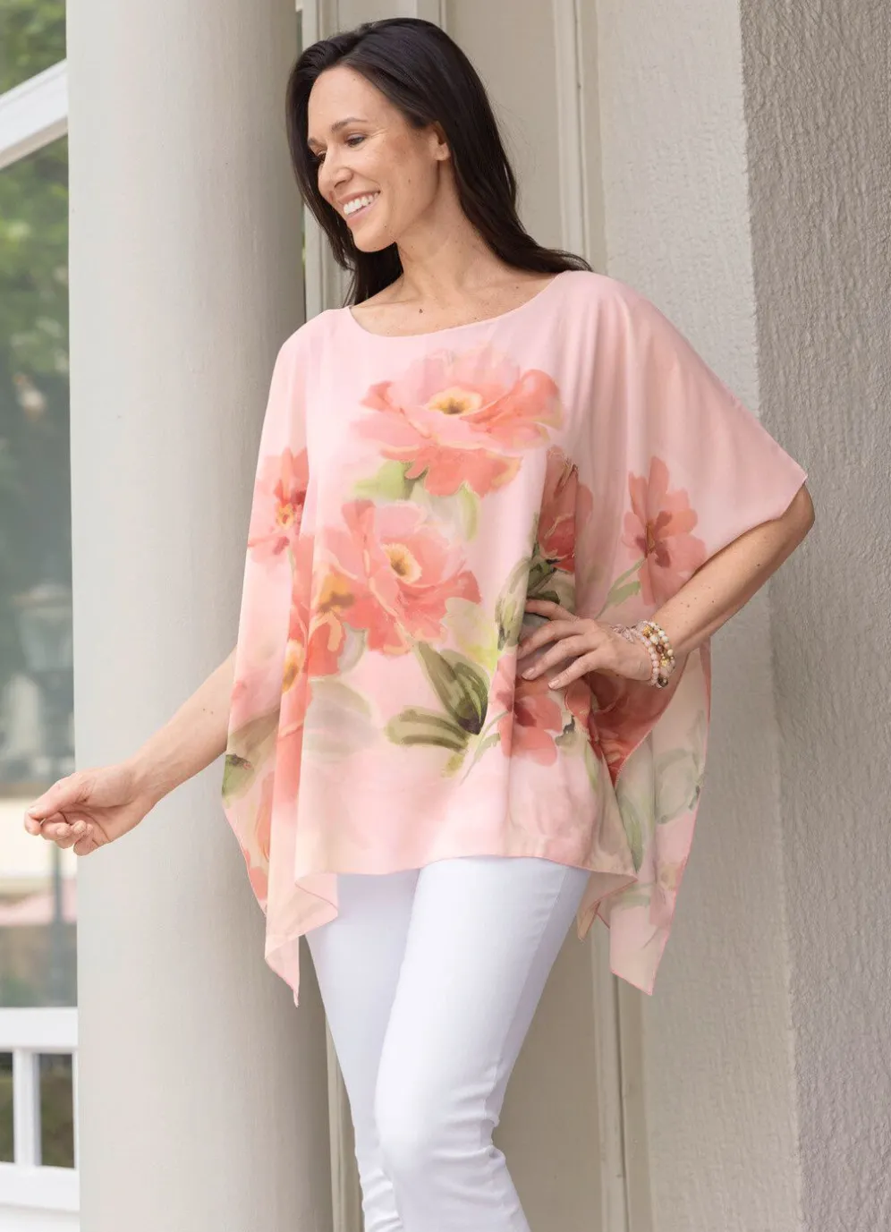 Jedes Teil ein Unikat! Figurumspielende Poncho-Tunika in Rosé-Mango-Grün-Bunt, mit eingearbeitetem Top, rundem Halsausschnitt sowie kurzen Ärmeln.