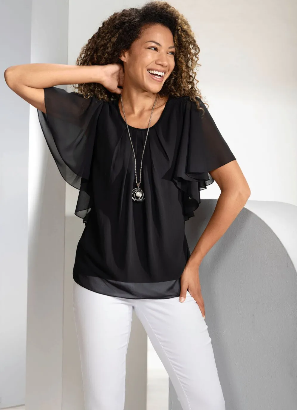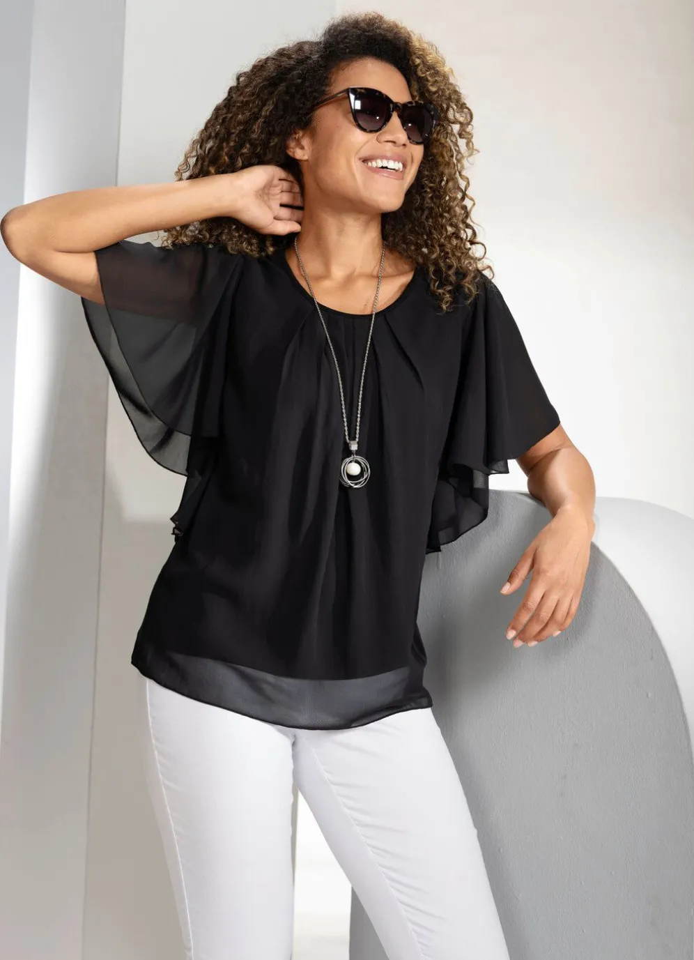 Große Klasse ist diese Poncho-Tunika mit eingearbeitetem Top, rundem Halsausschnitt, weiten Fledermausärmeln sowie toller Fältelung im Vorderteil und an der Rückenpasse.