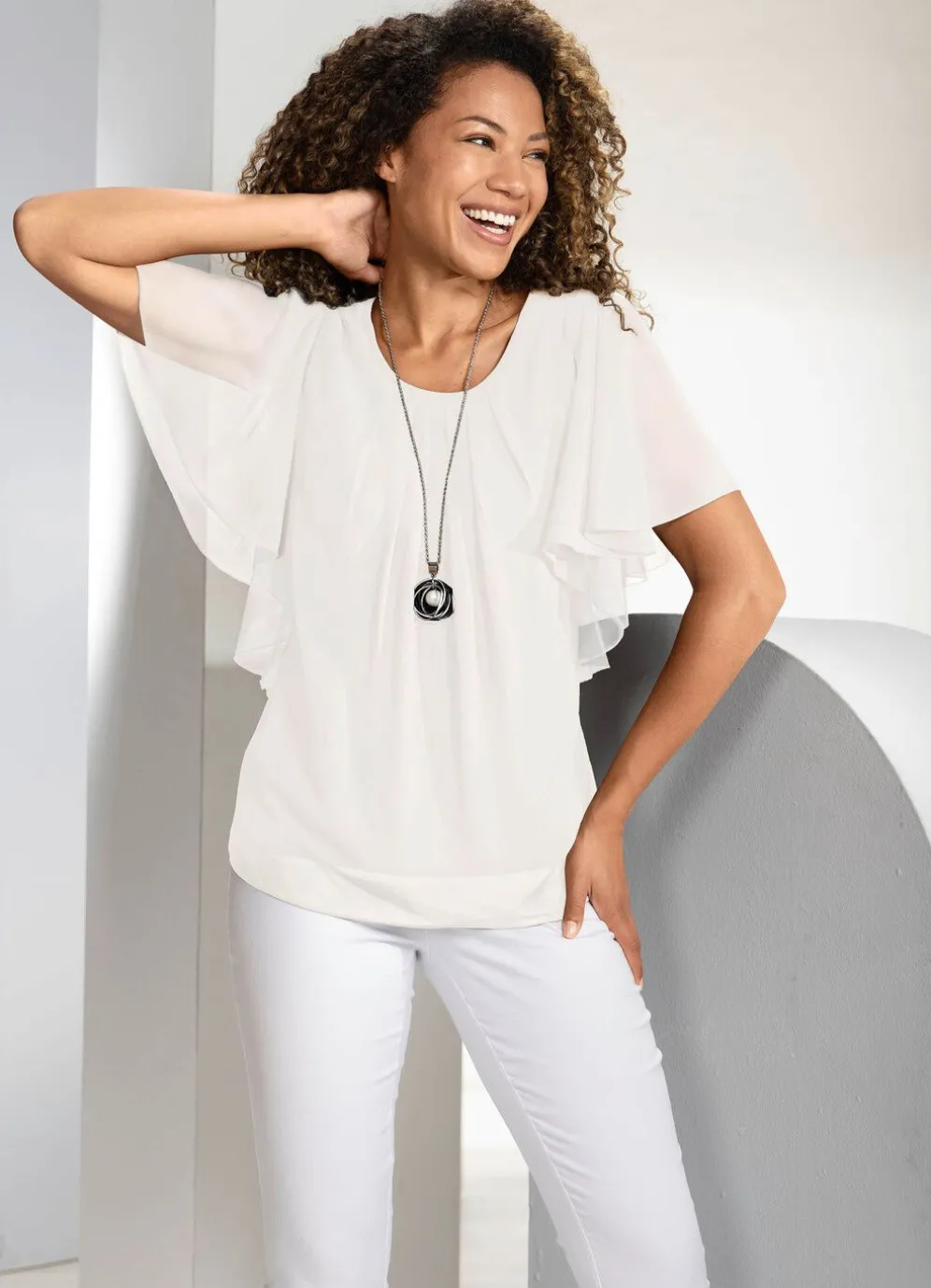 Große Klasse ist diese Poncho-Tunika mit eingearbeitetem Top, rundem Halsausschnitt, weiten Fledermausärmeln sowie toller Fältelung im Vorderteil und an der Rückenpasse.