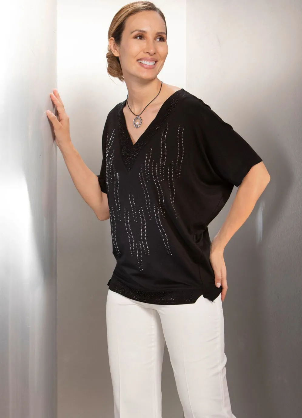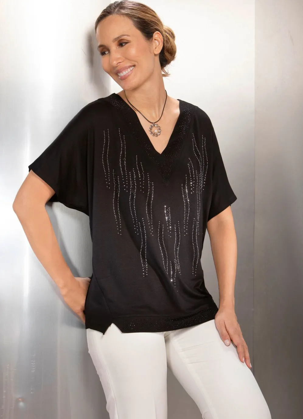 Schöne, schwarze Poncho-Tunika mit schwarzen Ziersteinen am V-Ausschnitt, schwarz- und silberfarbenen Schmucksteinen im Vorderteil, weiten, kurzen Ärmeln sowie zwei Schlitzen am Bündchen mit schwarzen Schmucksteinen.