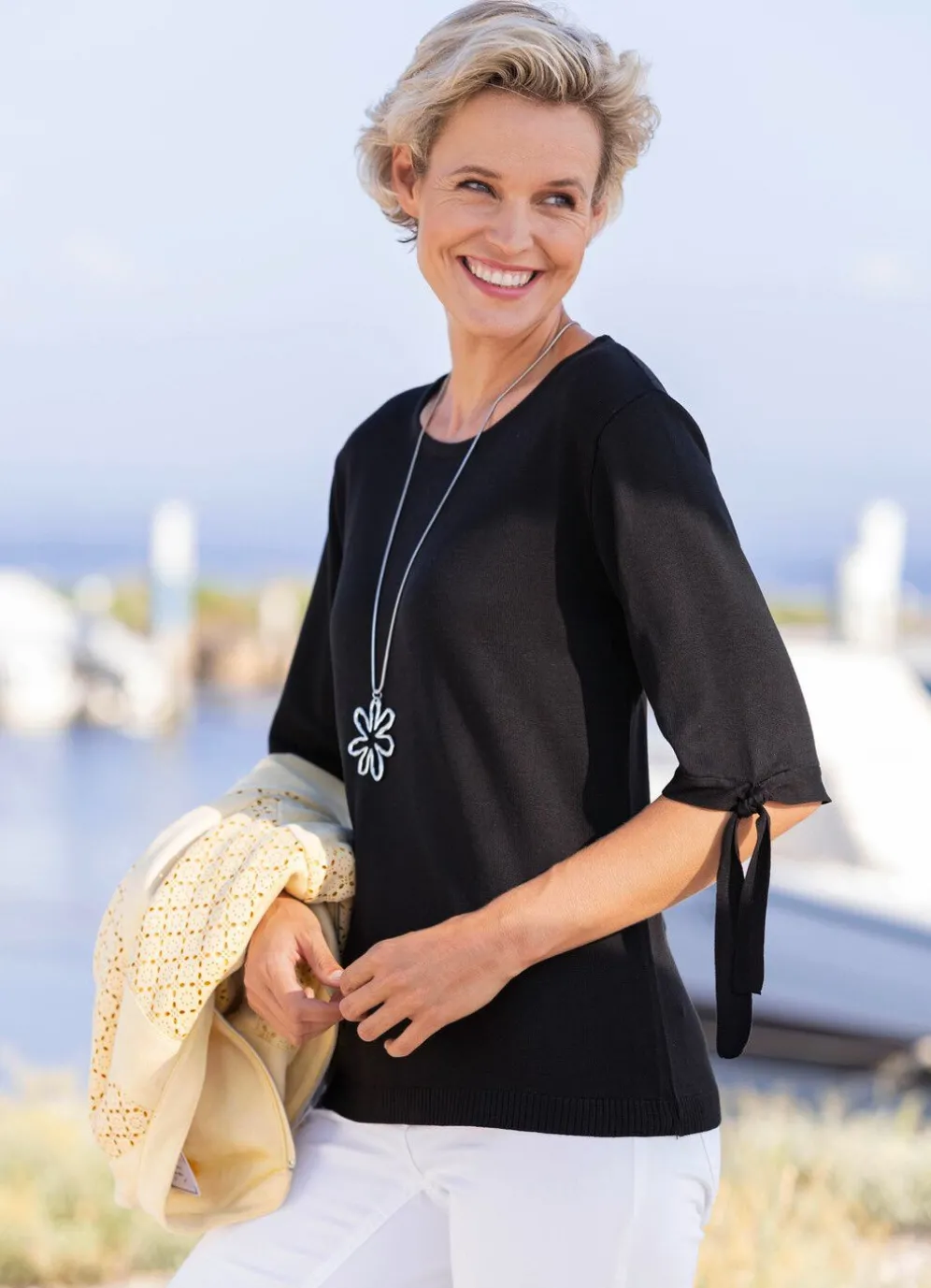 Hinreißender Pulli in Schwarz, mit rundem Halsausschnitt, kurzen Ärmeln mit Zierbindeband sowie schmalem Rippenbund am Saum.