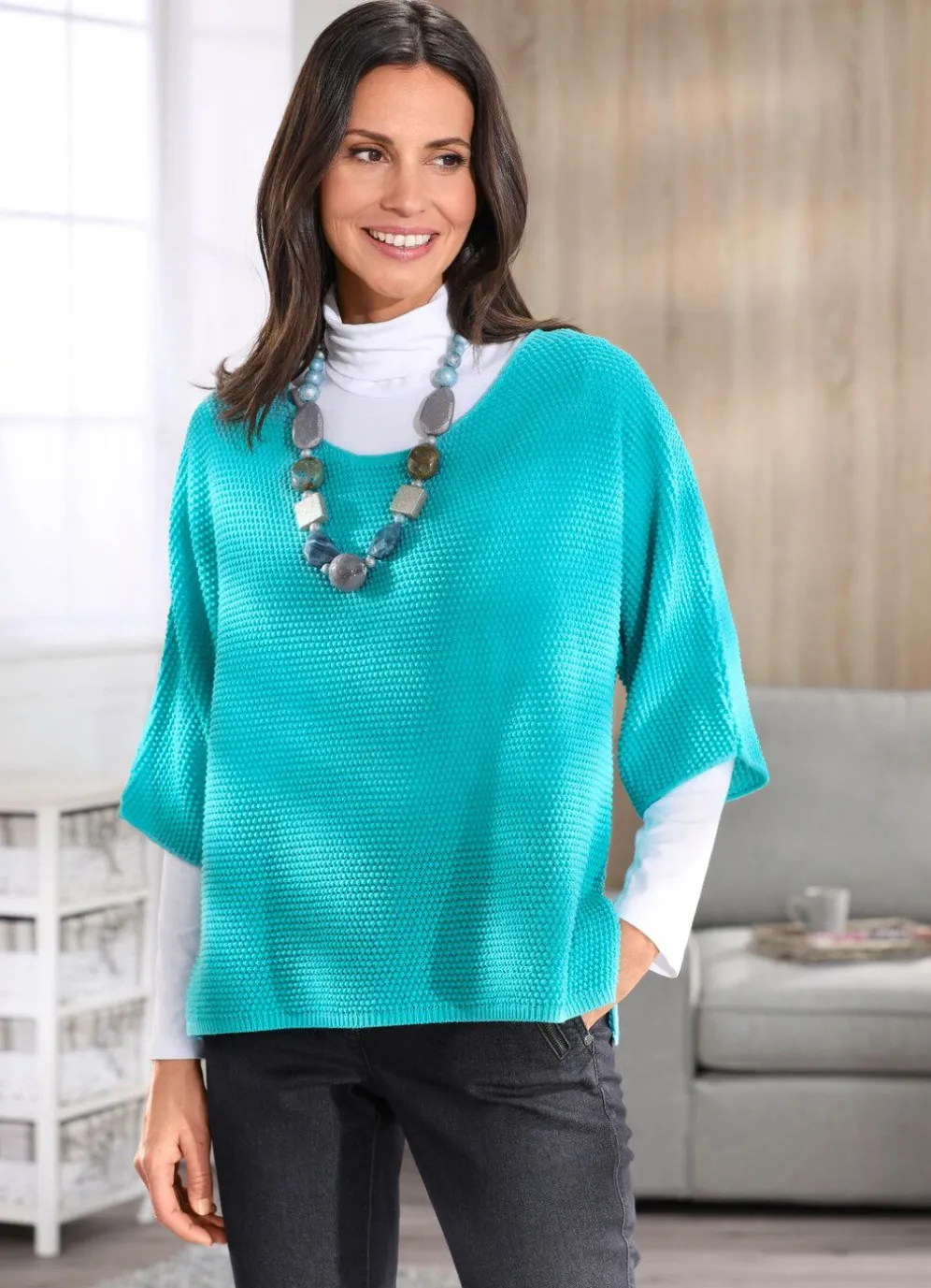 Ein perfekter Kombikünstler ist dieser Pulli in weiter Form: hübsche Alloverstruktur, runder Halsausschnitt, kurze Kimonoärmel, Ärmelabschlüsse und Seitenschlitze mit Innenrollkanten sowie fein gerippter Saum.