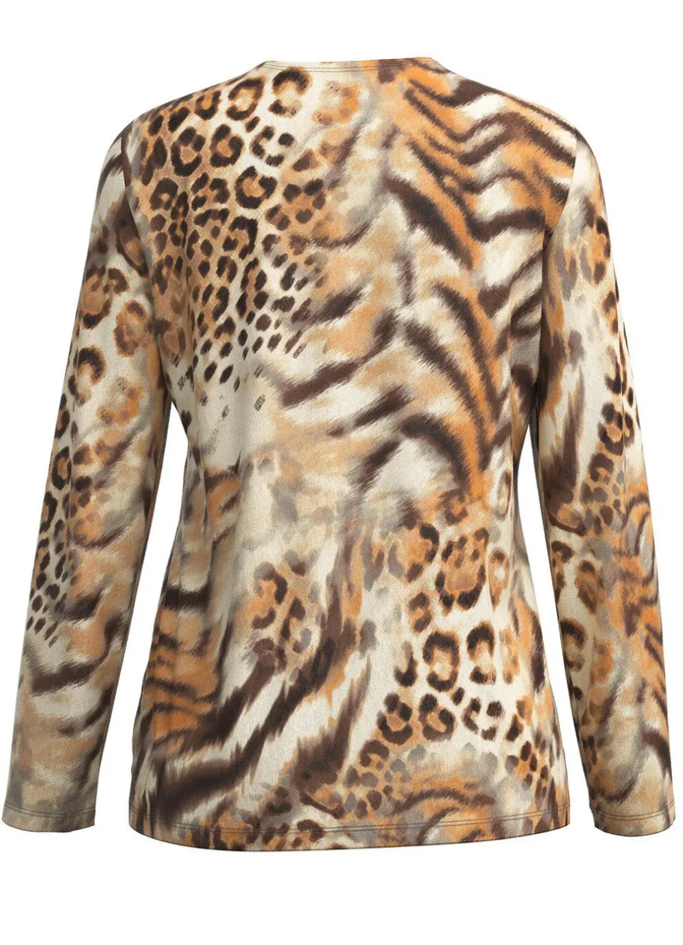 Jedes Teil ein Unikat! Umwerfender, braun-orange-cremefarbener Pullover mit legerem V-Ausschnitt, farbbrillantem Alloverdruck in Tierfelldessin sowie langen Ärmeln.