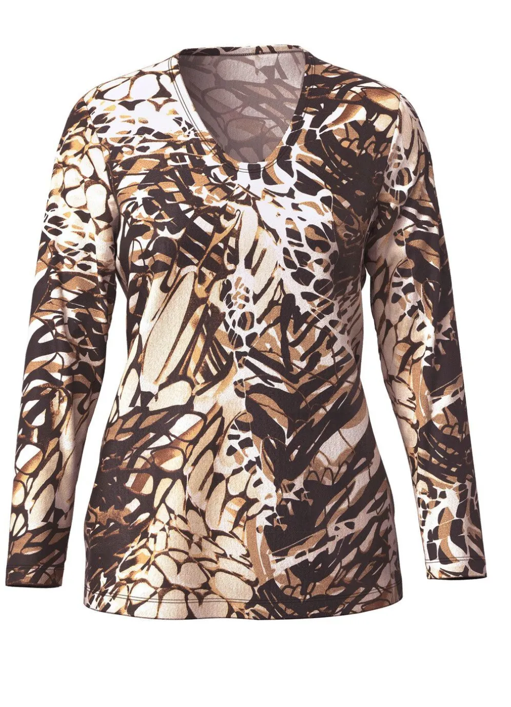 Jedes Teil ein Unikat! Toller Pullover mit legerem V-Ausschnitt, farbbrillantem Alloverdruck in Braun-Camel-Ecru sowie langen Ärmeln.