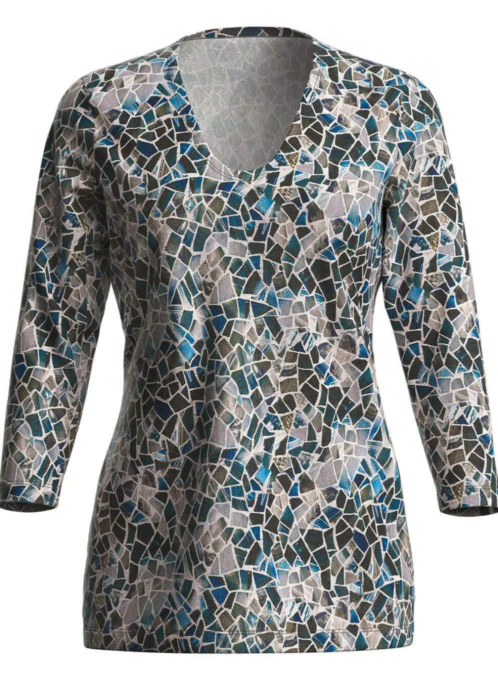Jedes Teil ein Unikat! Femininer Pullover mit legerem V-Ausschnitt, farbbrillantem Alloverdruck in Blau-Weiß-Multicolor sowie 3/4-langen Ärmeln.