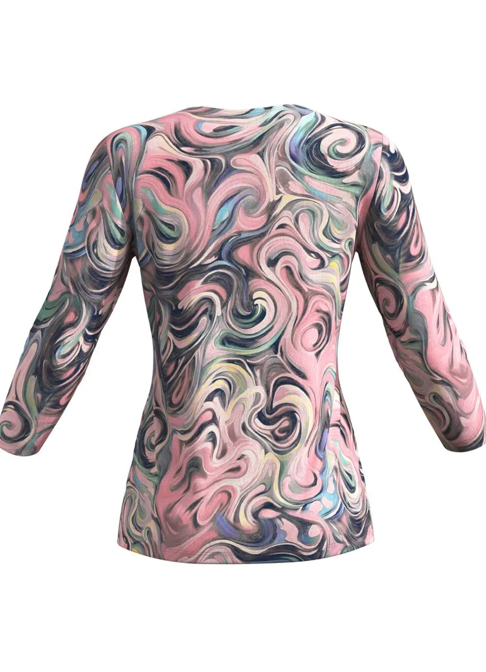 Jedes Teil ein Unikat! Toller Pullover mit rundem Halsausschnitt, farbbrillantem Alloverdruck in Rosa- Schwarz-Multicolor sowie 3/4-langen Ärmeln.