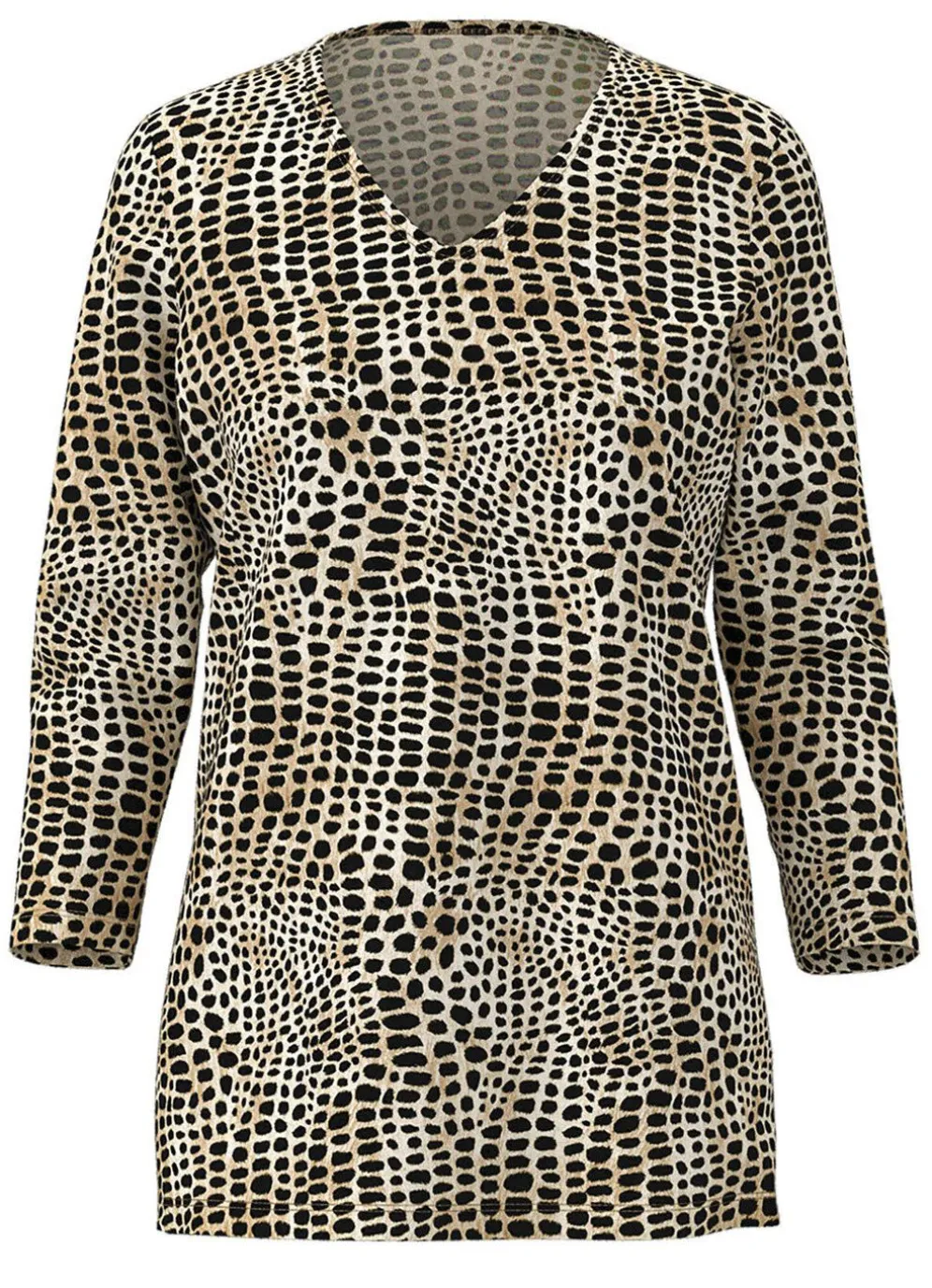 Jedes Teil ein Unikat! Toller Pullover in Beige-Schwarz, mit abgerundetem, legerem V-Ausschnitt, farbbrillantem Alloverdruck im Tierfelldessin sowie 3/4-langen Ärmeln.