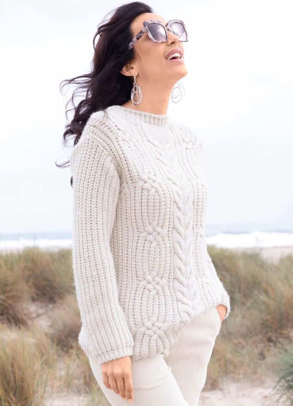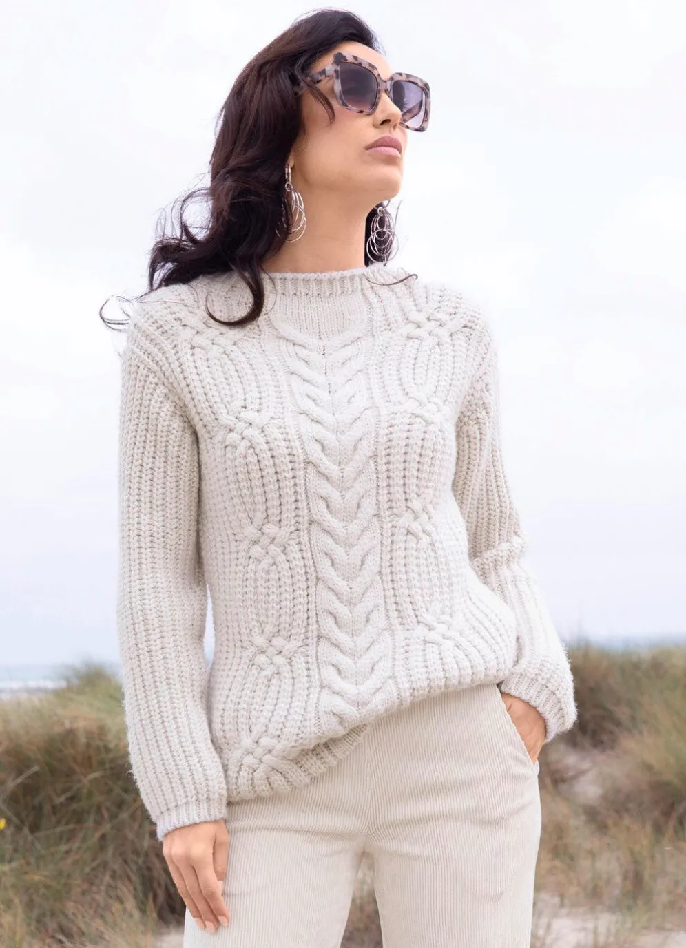 Ausdrucksstarker Pullover von TIZIA mit flauschigem, weichem Griff, Stehbund, überschnittener Schulterpartie, gröberem Perlfang allover, zusätzlichem, aufwendigem Zopfmuster im Vorderteil, langen Ärmeln sowie gerippten Abschlüssen.