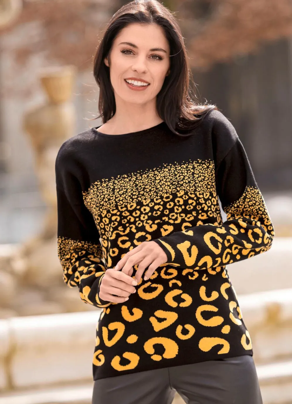 Setzen Sie einen fabelhaften Akzent mit diesem schwarz-gelben Pullover mit rundem Halsausschnitt, überschnittener Schulterpartie, ausdrucksstarkem Jacquard-Dessin in Tierfelloptik allover sowie langen Ärmeln.