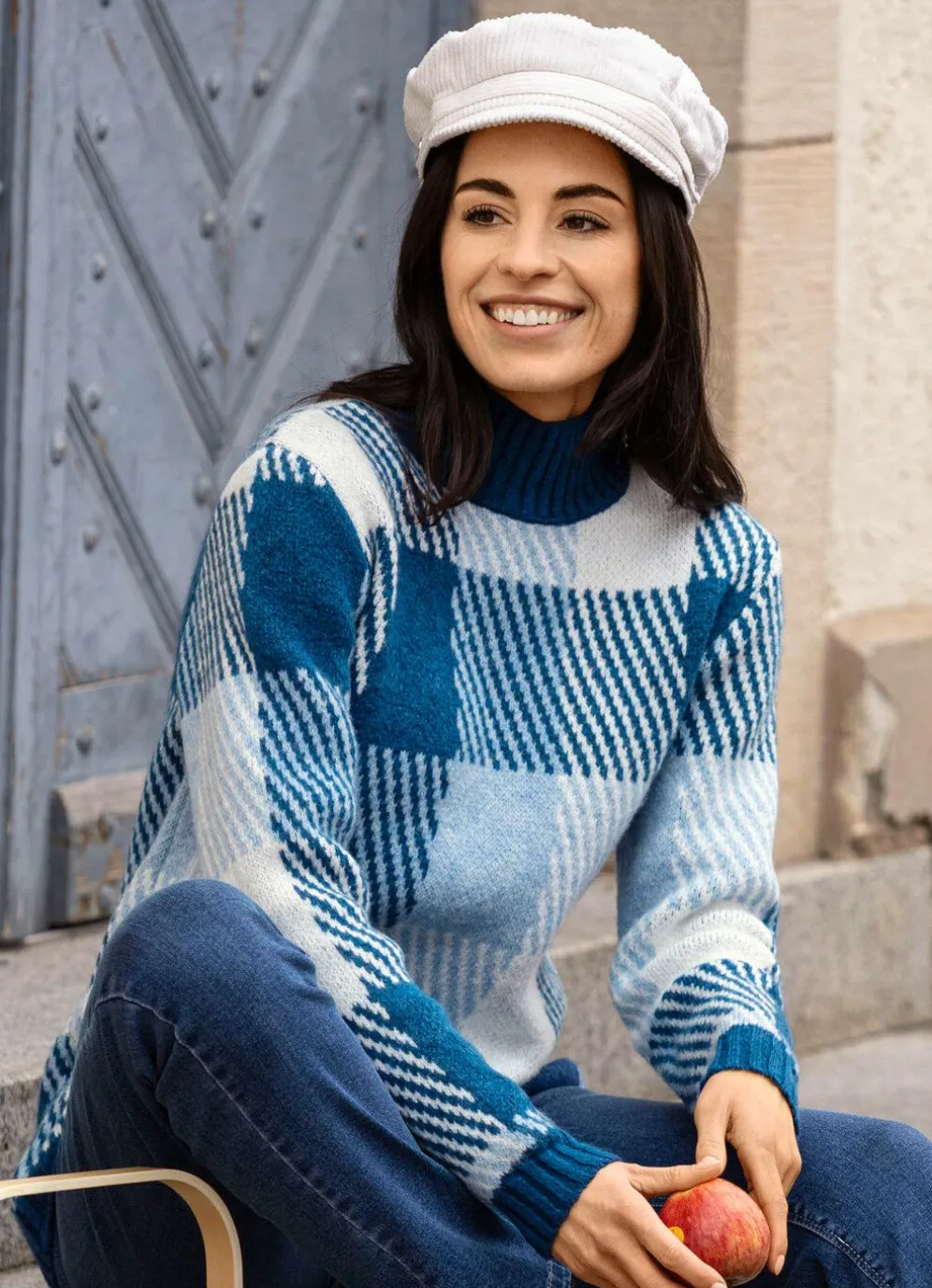 Bezaubernder Pullover in Jeansblau-Bleu-Weiß, mit Stehbund, grafischem Jacquard-Dessin allover, langen Ärmeln sowie Rippenbundabschlüssen.