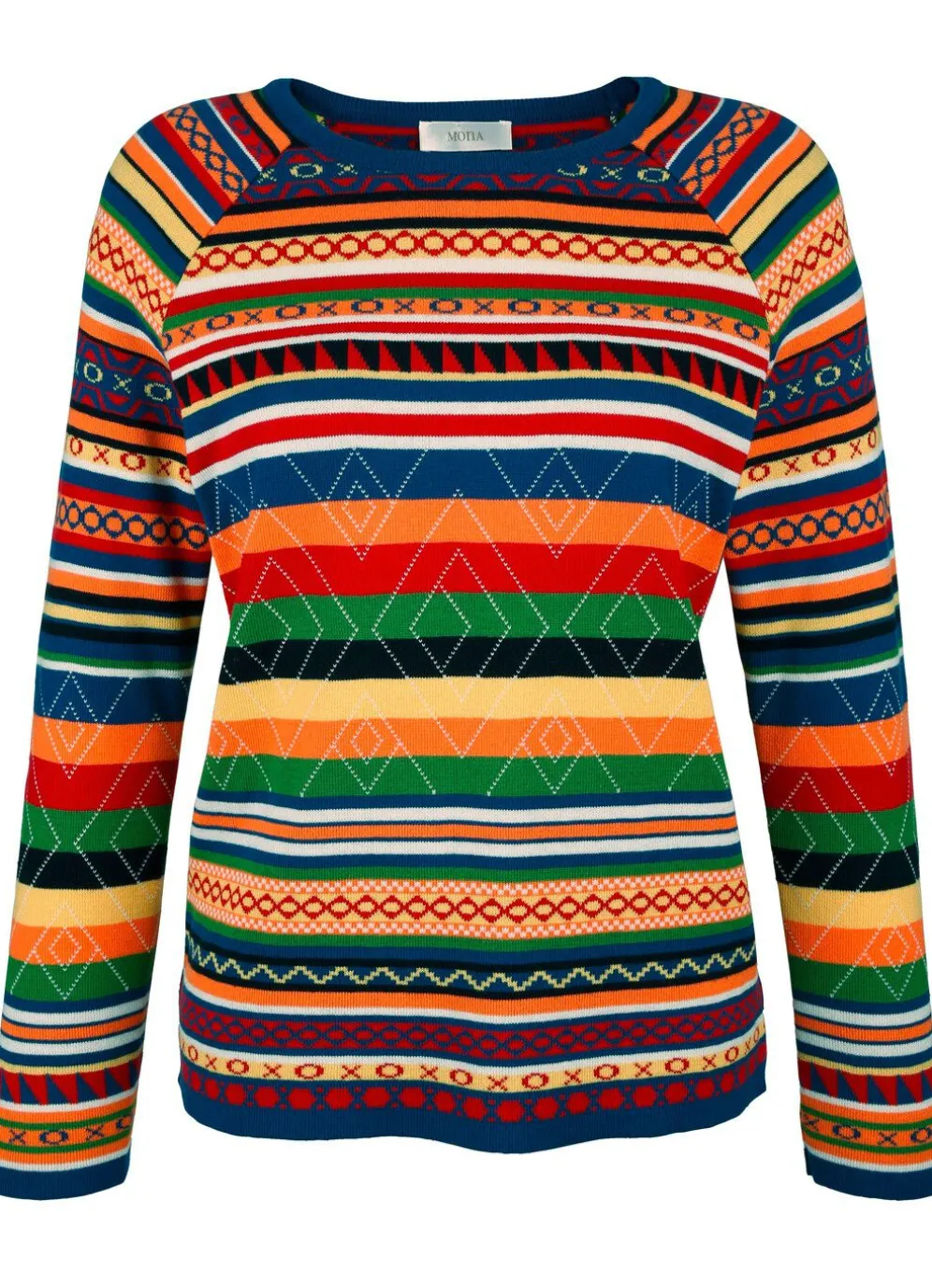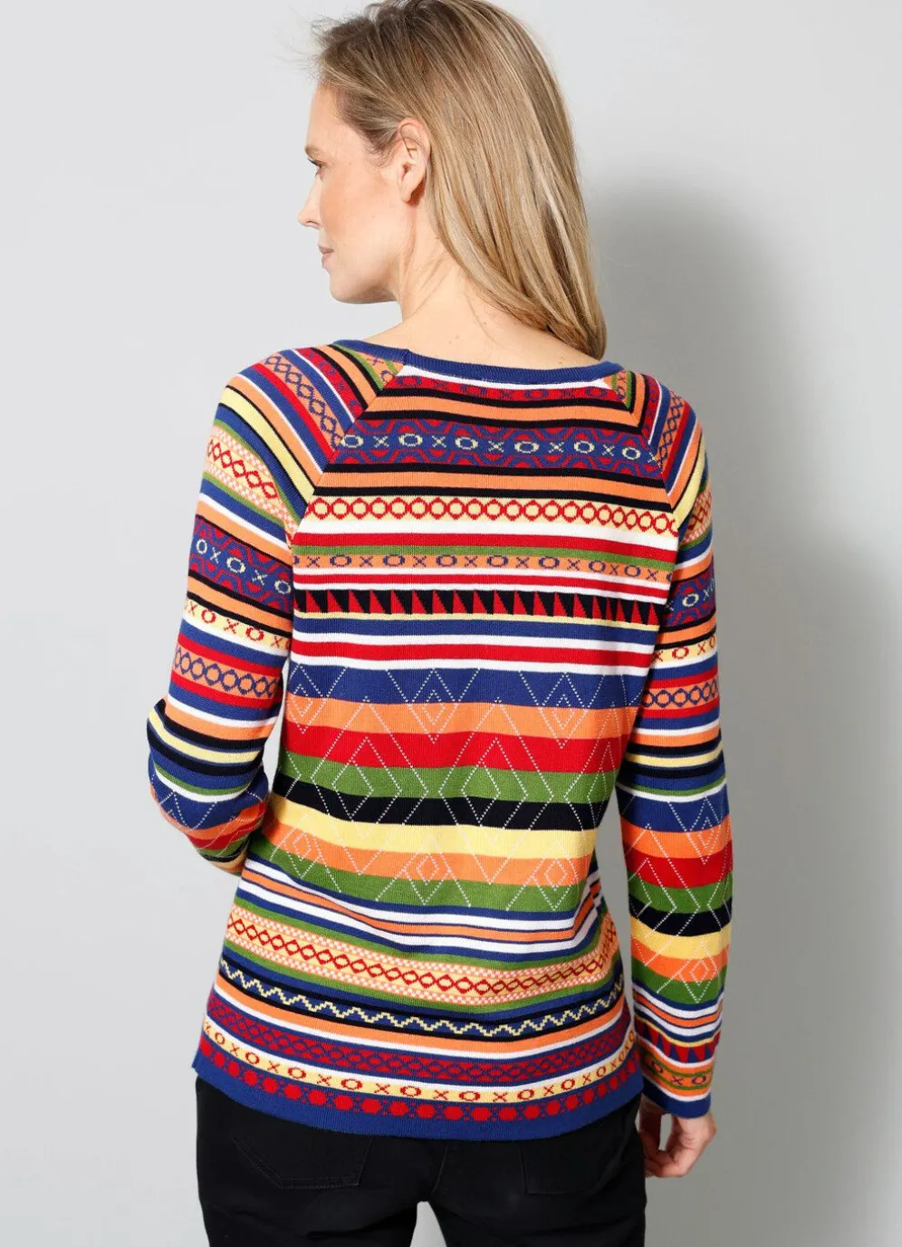 Pullover mit rundem Halsausschnitt, langen Raglanärmeln sowie farbenfrohem Mustermix in Ringeldessin allover. Länge ab ca. 64 cm. Jacquard aus 50% Baumwolle, 50% Polyacryl