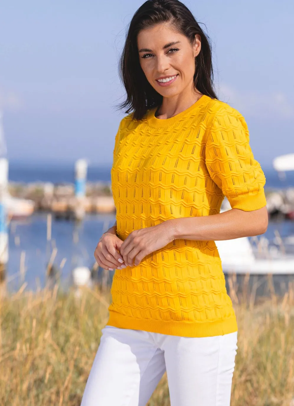 Sonnengelber Pullover mit aufwendigem Struktur- und Ajourmix in Wellenoptik allover, rundem Halsausschnitt, kurzen Ärmeln sowie gerippten Abschlüssen.