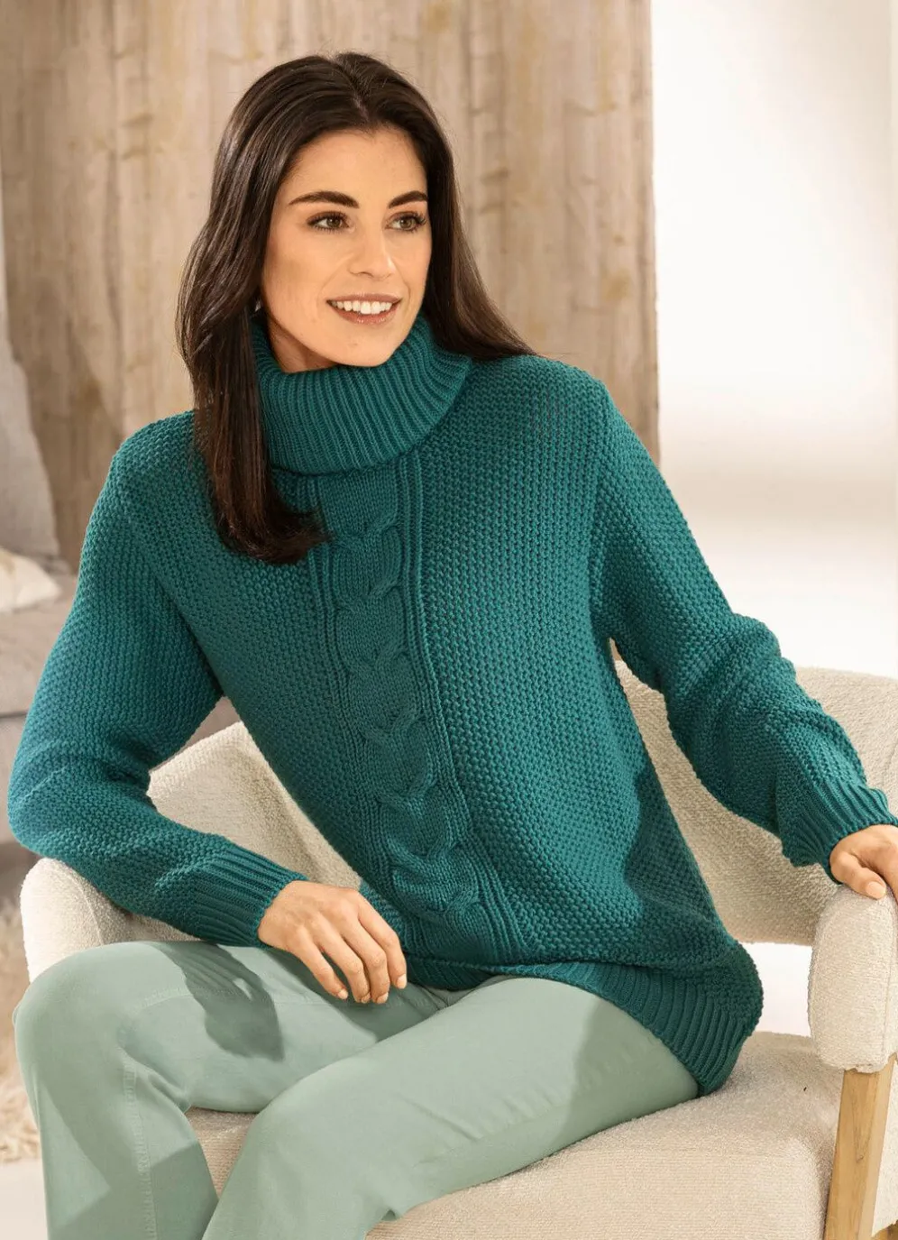 Toller, petrolfarbener Pullover mit Rollkragen, Reiskornstrick allover, streckendem Zopfdessin im Vorderteil, langen Ärmeln sowie gerippten Abschlüssen.