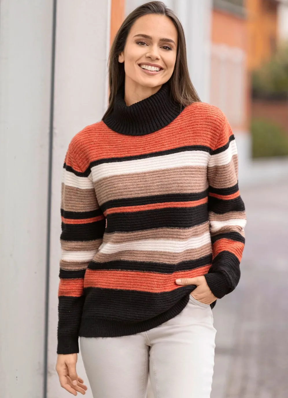 Wunderschöner Pullover in Schwarz-Hummer-Multicolor, mit halsfernem Rollkragen, Strukturstrick in Streifendessin allover, langen Ärmeln sowie gerippten Abschlüssen.