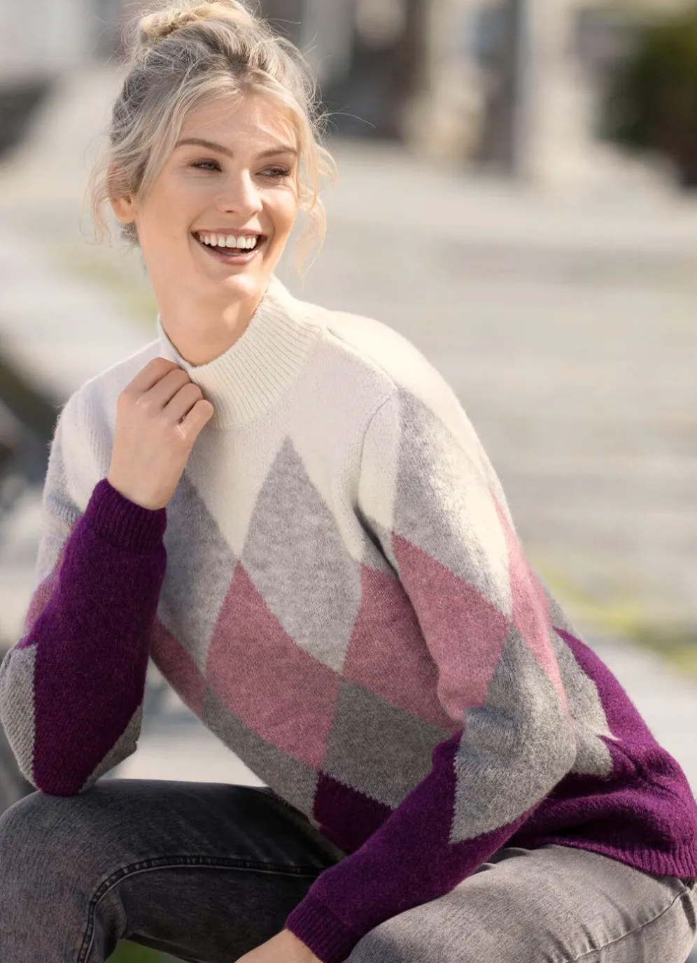 Pfiffiger Pullover: Stehbund, Rhombenmuster rundum, lange Ärmel sowie gerippte Abschlüsse.