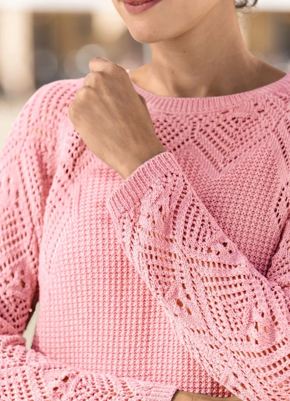 Ein raffinierter Blickfang ist dieser Pullover mit flachem, rundem Halsausschnitt, Ajourstrick entlang der langen Ärmel und im oberen Bereich, Reiskornstrick im unteren Bereich des Vorder- und Rückteils sowie gerippten Abschlüssen.