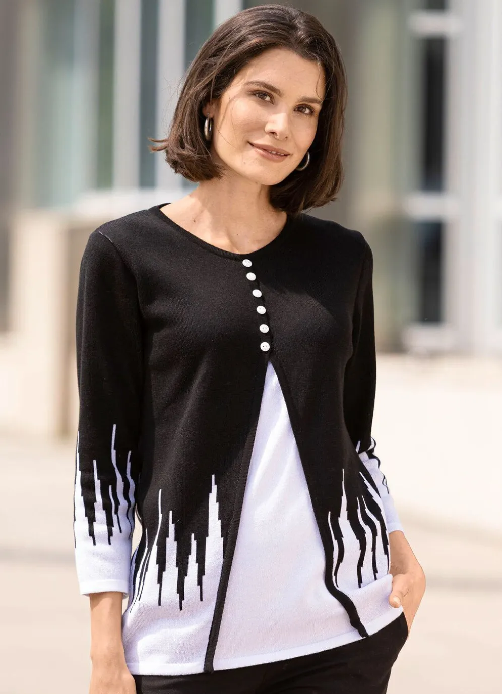 Pullover in leichter A-Linie: runder Halsausschnitt, kontrastfarbener streckender Einsatz im Vorderteil, Zierknopfleiste, Ärmel in modischer Länge.
