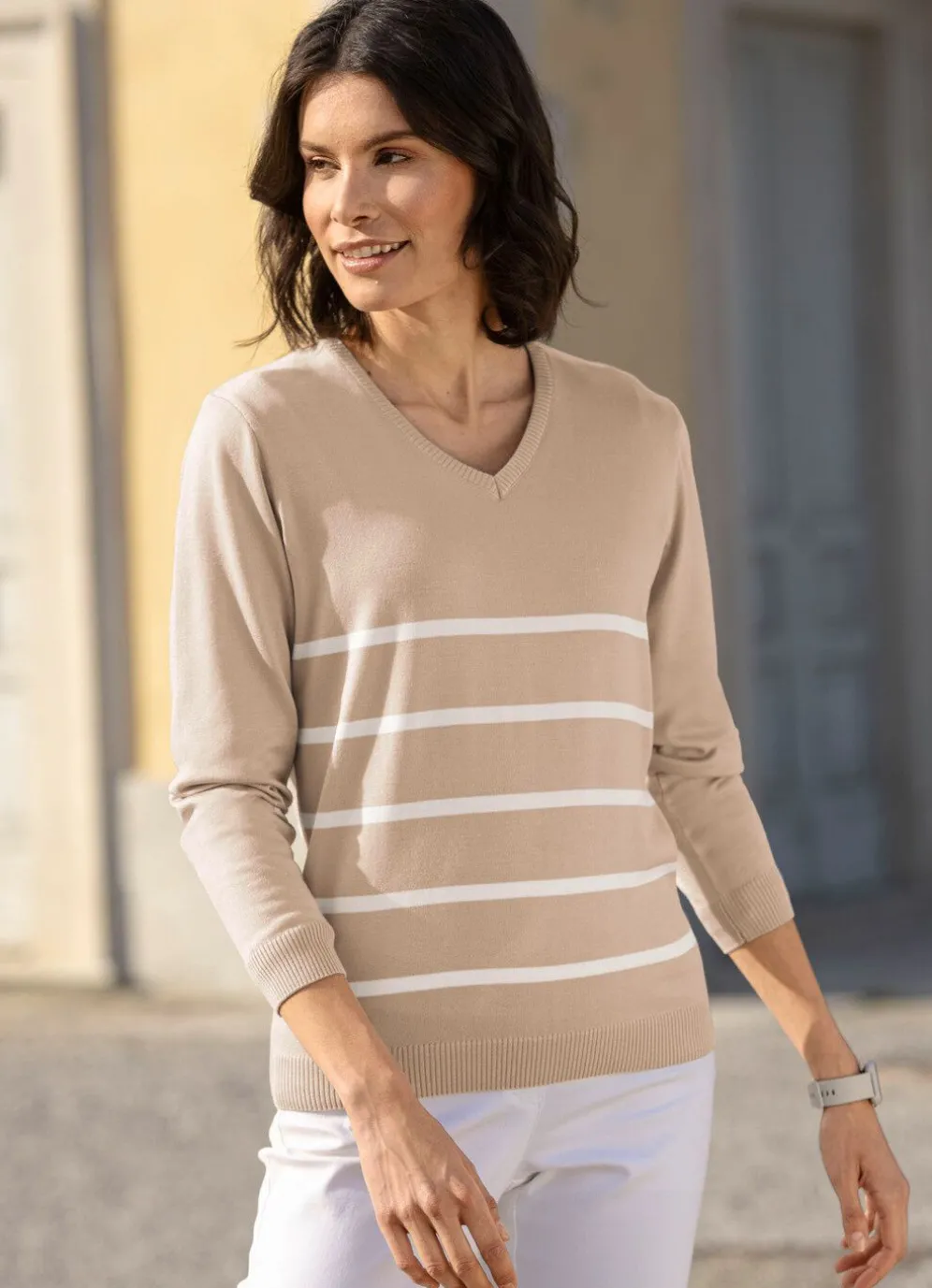 Angenehm weich im Griff ist dieser Pullover in Beige-Weiß mit V-Ausschnitt, Streifendessin im Vorder- und Rückteil sowie Rippenbund an den langen Ärmeln und am Saum.