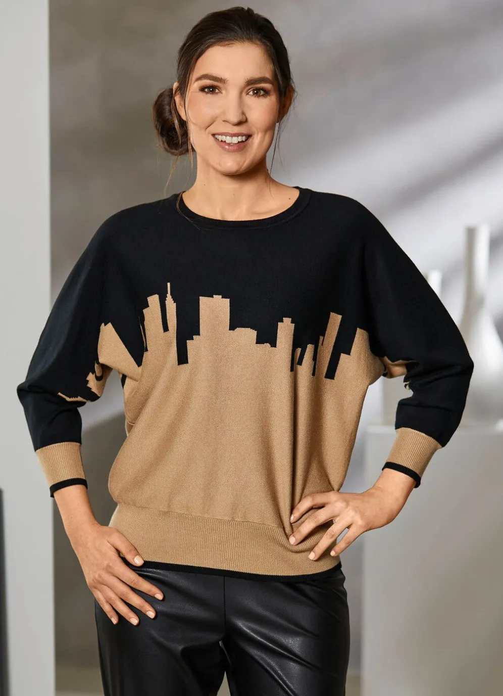 Besonderer Pullover: weicher Griff, flacher Halsausschnitt, „Skyline“-Motiv im Vorder- und Rückteil, 3/4-lange Fledermausärmel und Saum mit Rippenbündchen und Kontrastabschlüssen.