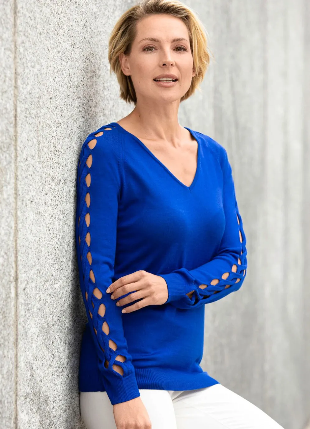 Pullover mit V-Ausschnitt sowie langen Raglanärmeln mit elegantem Zopfmuster und Cut-Outs.