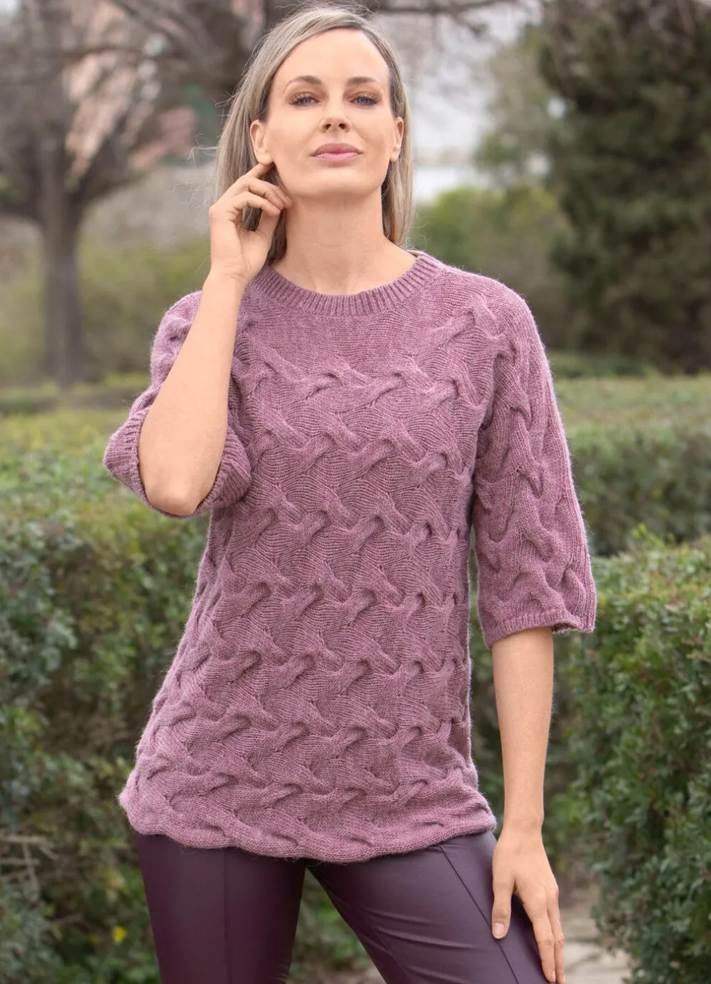 Pullover von TIZIA in effektvoller Modemasche mit aufwendiger Wellenstruktur allover, überschnittener Schulterpartie, gerippten Abschlüssen am runden Halsausschnitt und an den Ärmeln in modischer Länge sowie nach innen gerolltem und gewelltem Saumabschluss.