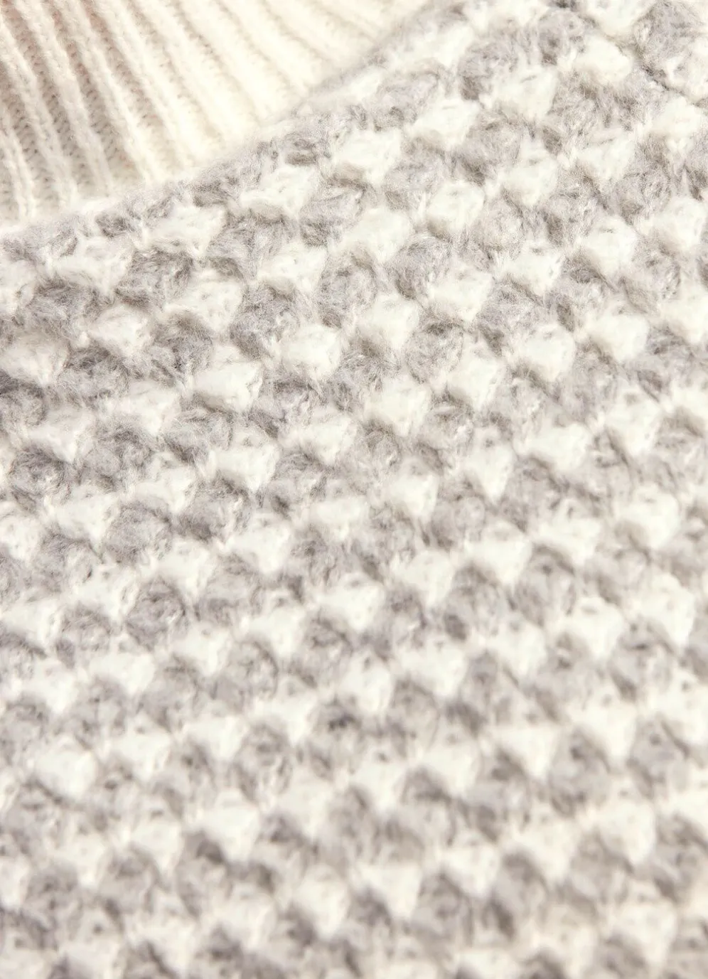 Flauschig weicher Pullover von laurakent in Ecru-Hellgrau meliert mit Stehbund, aufwendigem, plastischem Strukturmuster allover, langen Raglanärmeln sowie gerippten Abschlüssen mit dezentem Ajourmuster.
