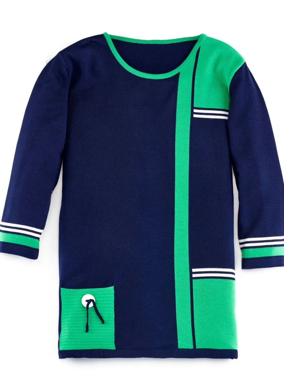 Grafischer Pullover: runder Halsausschnitt mit Kontrastabschluss, Intarsien im Vorderteil, Kontraststreifen an den Abschlüssen der 3/4-langen Ärmel, eine dekorative Tasche mit Knopf und Strickbandzier sowie Seitenschlitze.