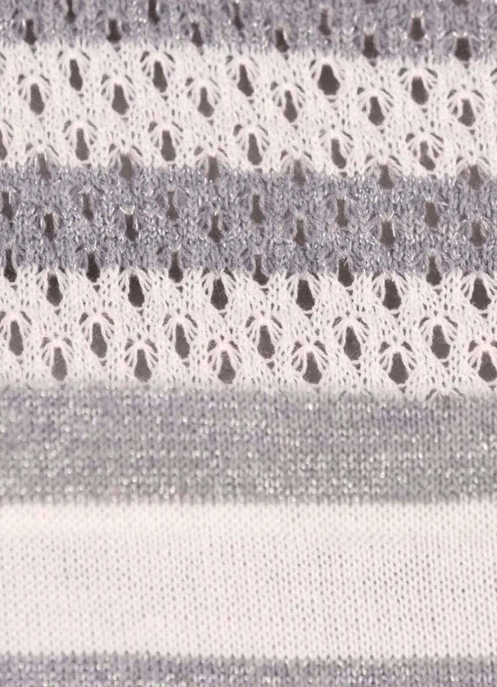 Hübscher, weiß-silberfarbener Pullover mit rundem Halsausschnitt, Ajourmuster im oberen Bereich rundum, Streifendessin mit Glitzerakzenten allover sowie etwas weiteren Ärmeln in modischer Länge.