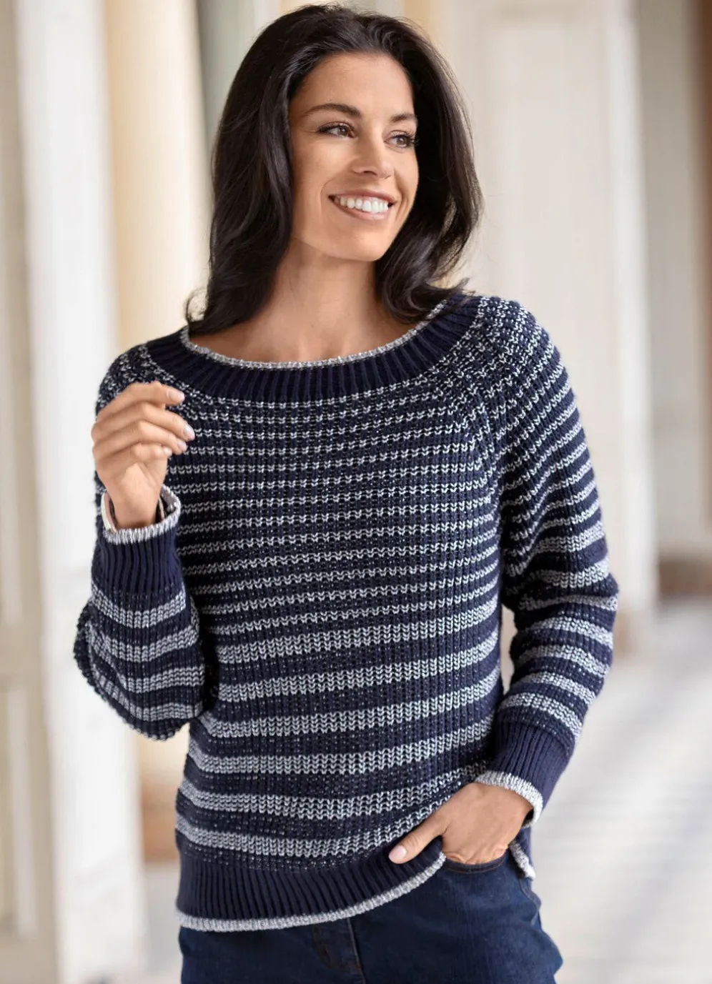 Marine-Silberfarbener Pullover mit flachem Halsausschnitt, edlen, silberfarbenen Glitzereffekten allover, langen Raglanärmeln sowie Rippenabschlüssen.