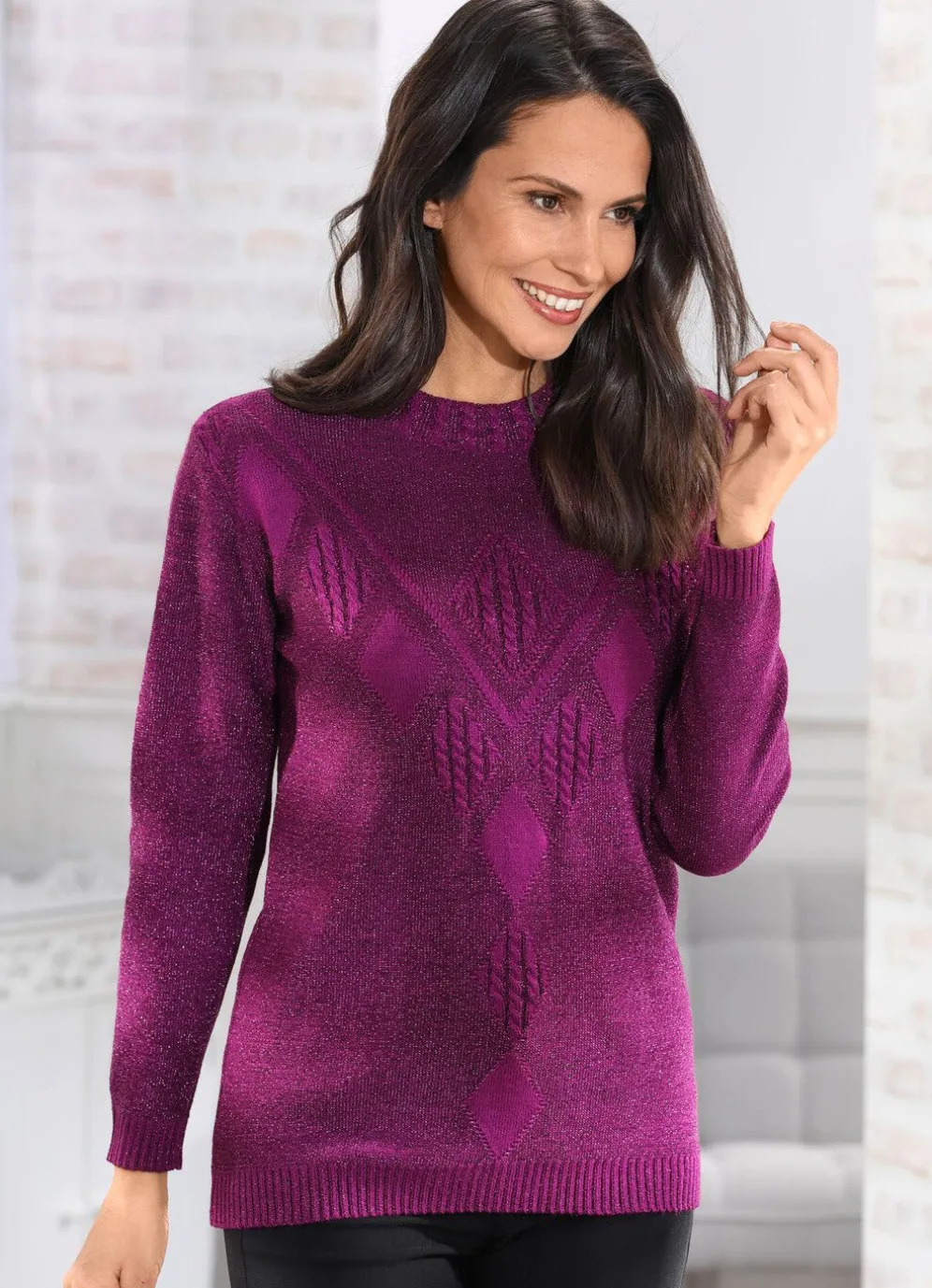 Ein edler Blickfang ist dieser Pullover mit Stehbund: rautenförmiges Zopfdessin im Vorderteil, intensiver, hochwertig plattierter Ton-in-Ton Glitzereffekt allover sowie Rippenbund an den Abschlüssen der langen Ärmel und am Saum.