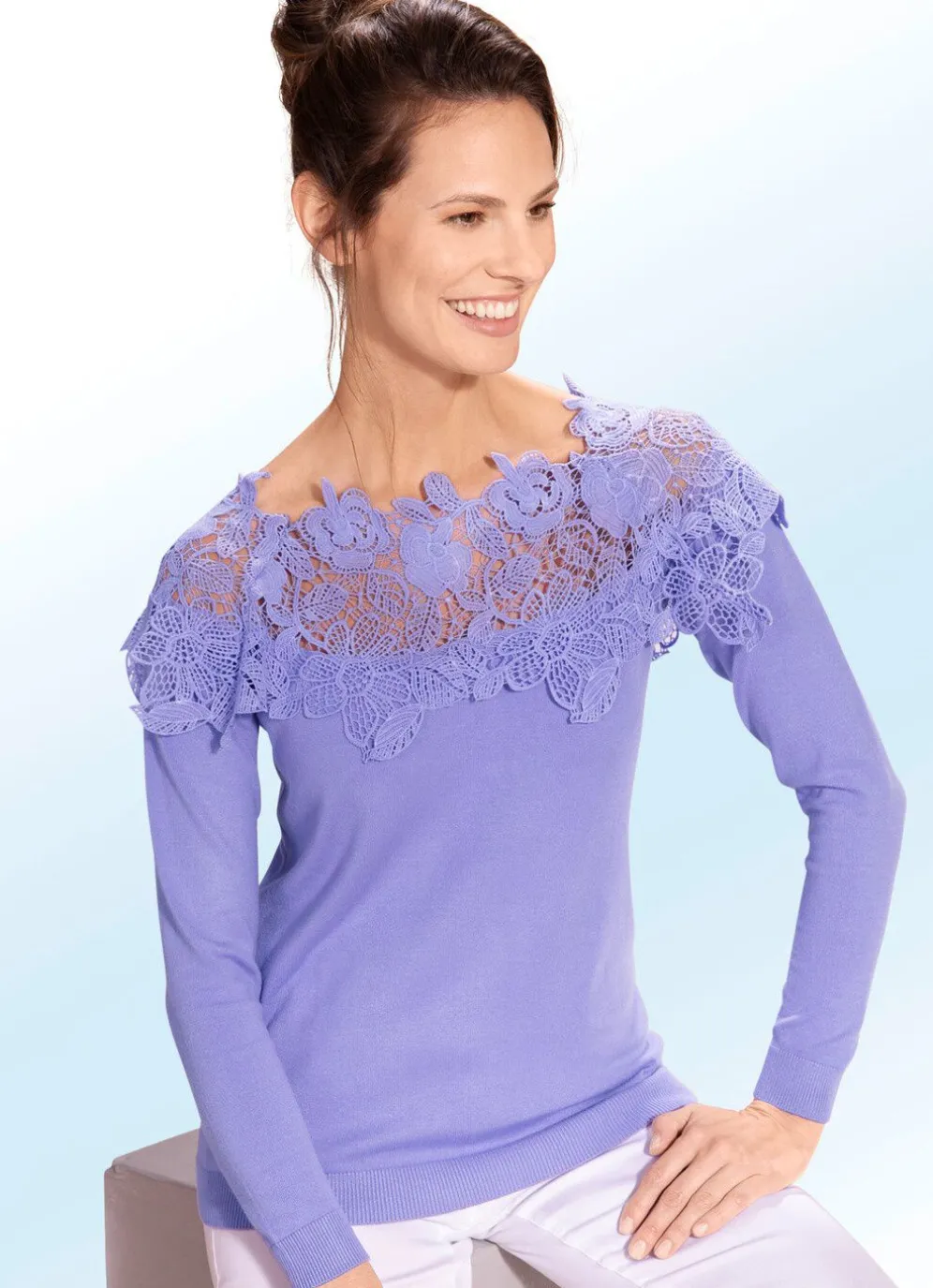 Ein bezaubernder Hingucker ist dieser eindrucksvolle Pullover: edler Spitzenbesatz am flachen Halsausschnitt und im oberen Bereich rundum sowie lange Ärmel und Saum mit Rippenbund-Abschlüssen.