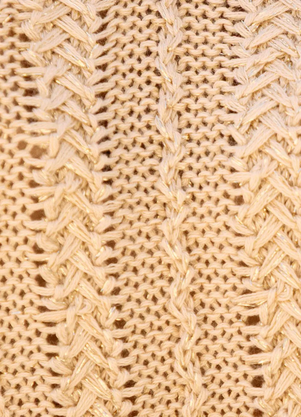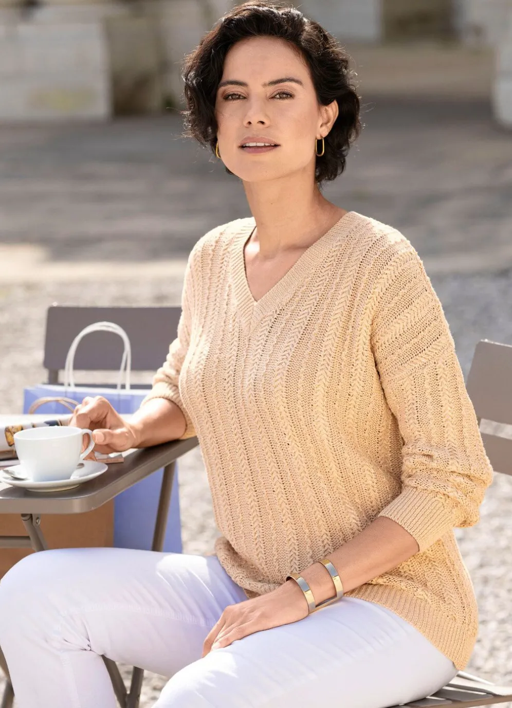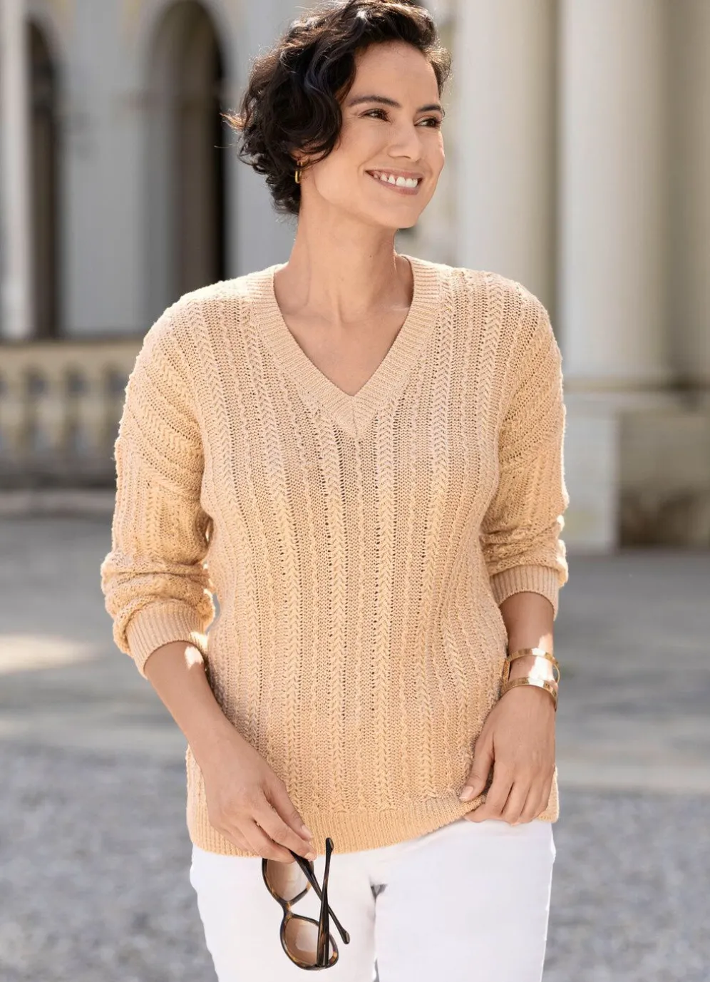 Ein edler Modeschatz ist dieser beigefarbene Pullover in Zöpfchenoptik, mit V-Ausschnitt, überschnittener Schulterpartie, langen Ärmeln sowie Strukturmix in streckendem Streifendessin und mit tollen Glitzerakzenten allover.