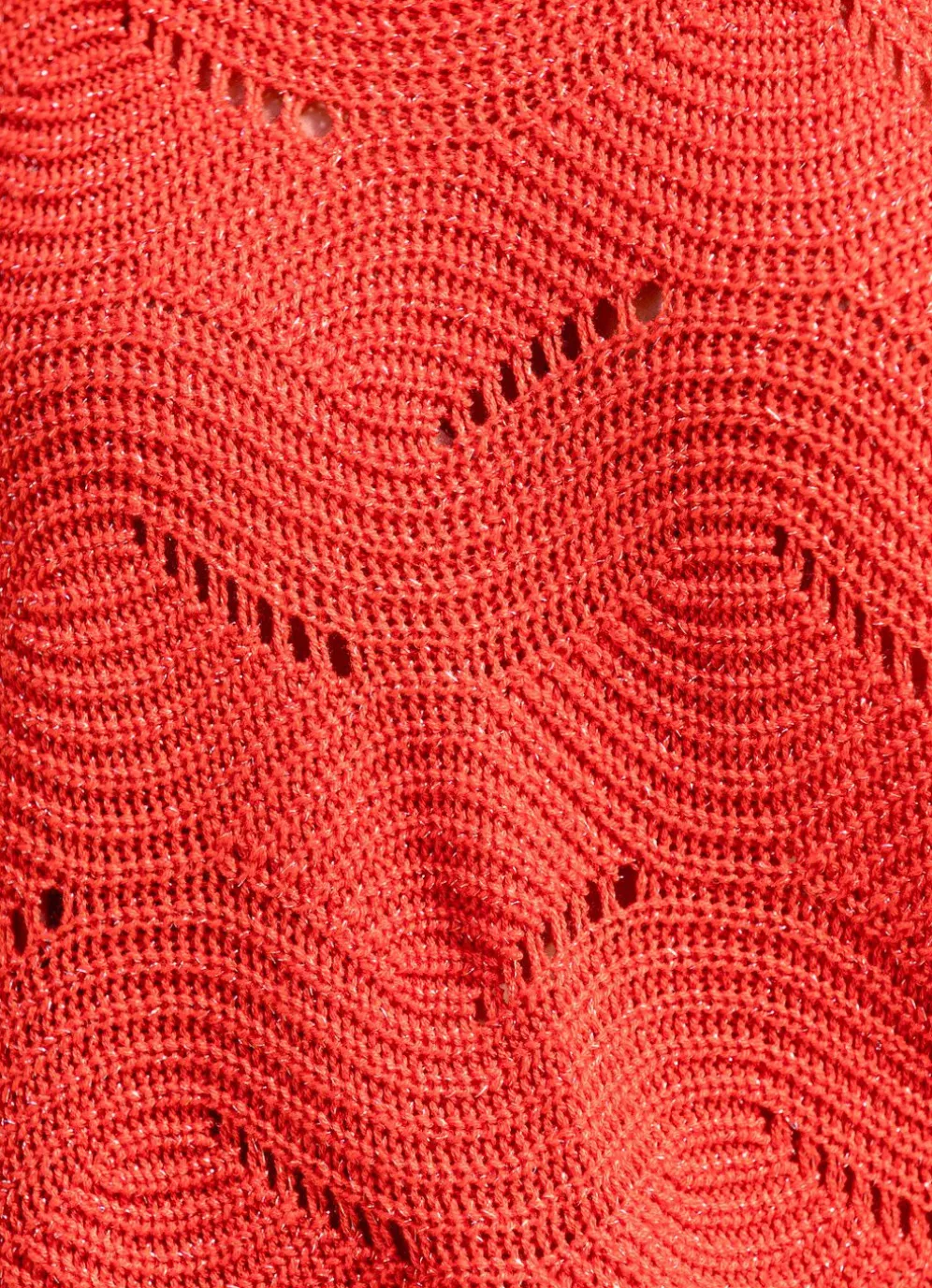 Flotter, orangefarbener Pullover in überschnittener Form, mit hübschem Strukturmuster in Wellendessin, edlen Glitzereffekten und Ajourakzenten allover, Rippenbund an den Fledermausärmeln in modischer Länge sowie Biesenabschlüssen am U-Boot-Ausschnitt und am Saum.