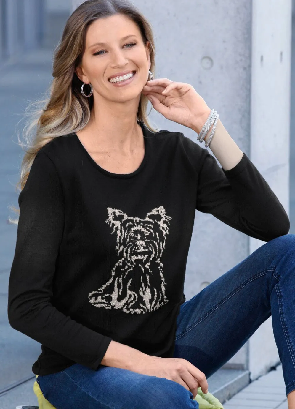 Setzen Sie Akzente mit diesem kombifreundlichen Pullover in Schwarz-Beige meliert, mit Hundemotiv in Bouclégarn im Vorderteil, rundem Halsausschnitt sowie langen Ärmeln.