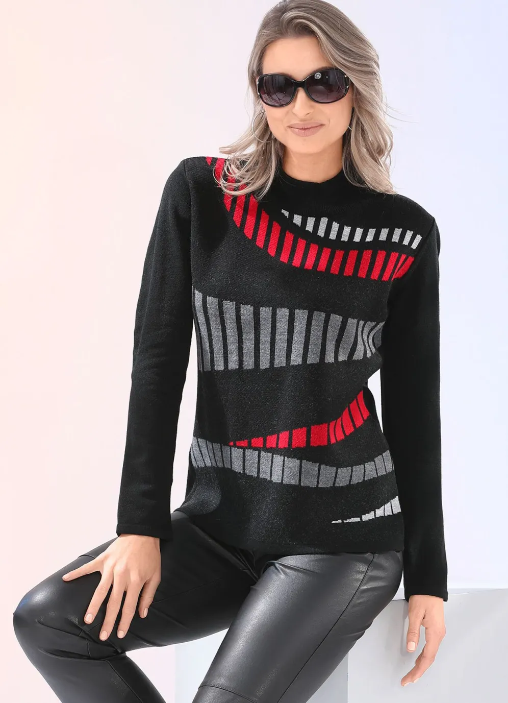 Ein extravaganter Hingucker ist dieser Pullover in Schwarz-Rot-Grau: fein gerippter Stehbund, Jacquard-Vorderteil mit Streifen in Wellendessin, lange Ärmel und Rückteil in uni Schwarz sowie Melangeakzente.
