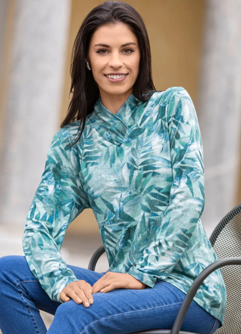 Jedes Teil ein Unikat! Wunderschöner Pullover in Grün-Blau-Multicolor mit raffinierter Kragenverarbeitung am überkreuzten V-Ausschnitt, floralem Alloverdruck sowie langen Ärmeln.