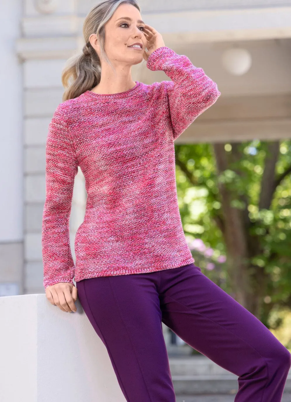 Pullover von RABE in Pink-Multicolor, mit Rollkante am runden Halsausschnitt, Reiskornstruktur allover, langen Ärmeln sowie gerippten Abschlüssen.