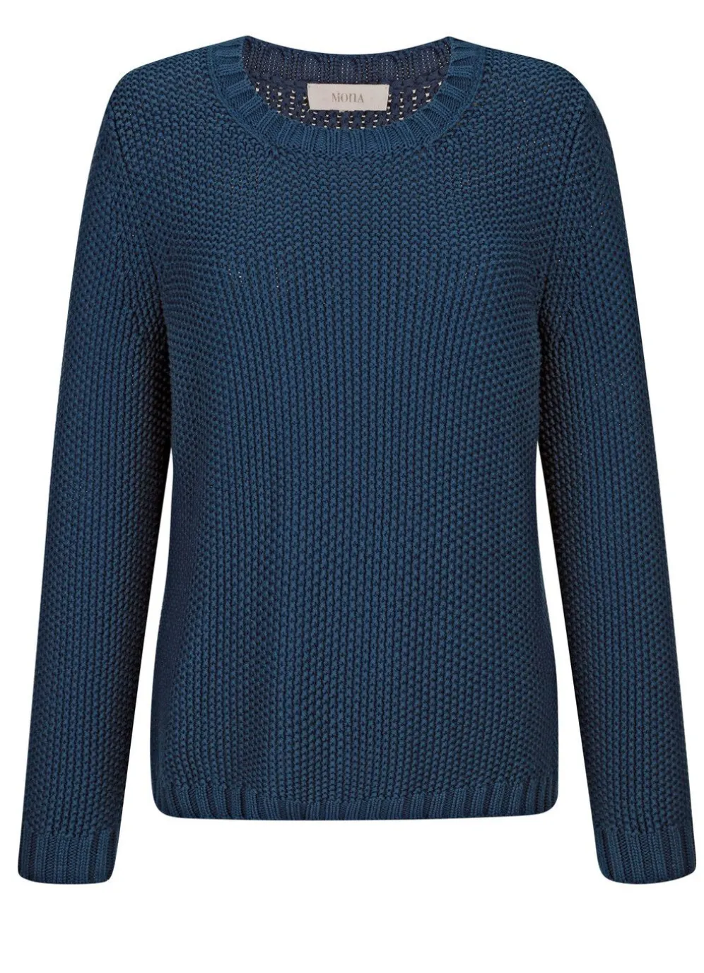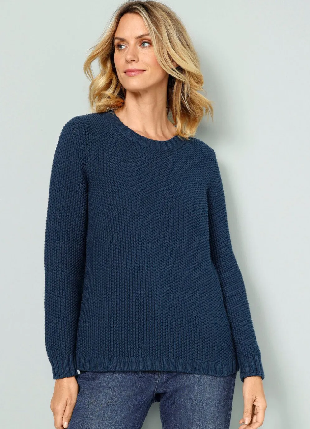 Pullover in Reiskornstrick mit rundem Halsausschnitt, langen Ärmeln sowie gerippten Abschlüssen.