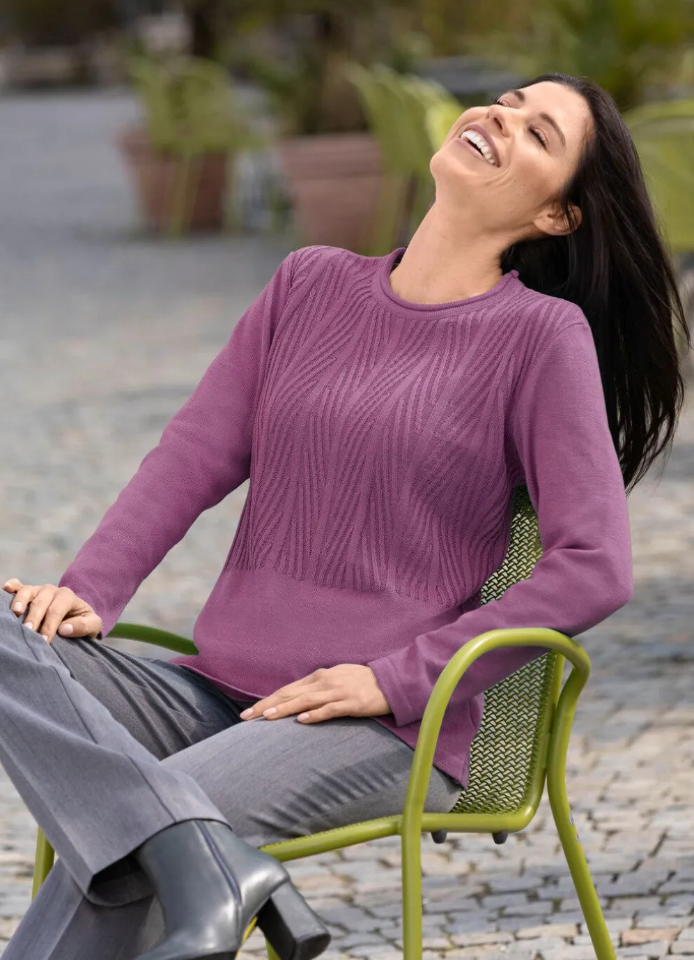 Zauberhafter Pullover mit rolliertem, rundem Halsausschnitt, streckendem Strukturstrick im Vorderteil sowie langen Ärmeln.