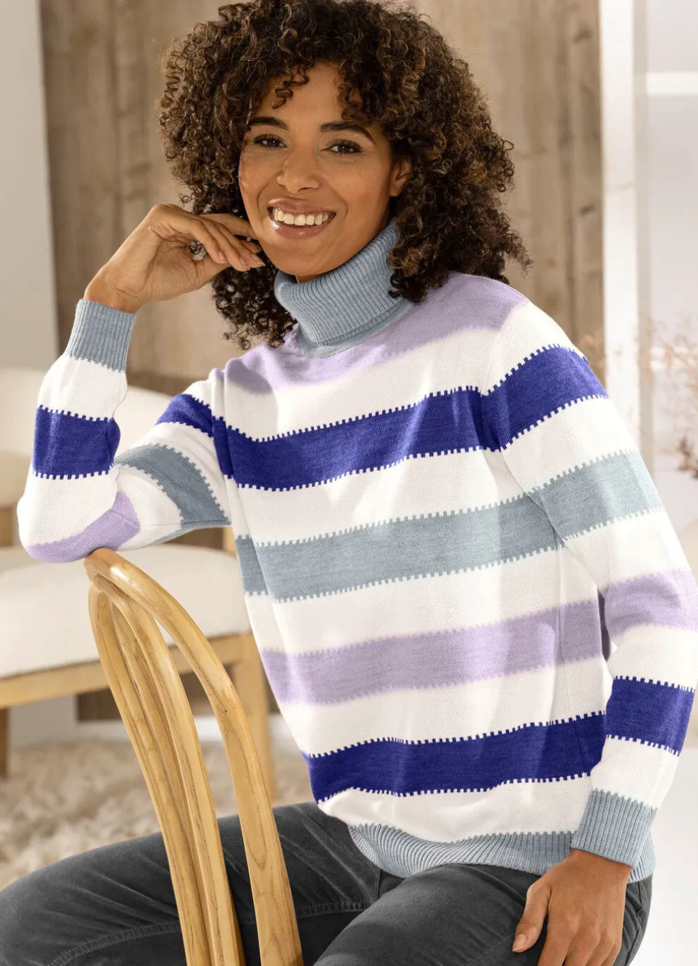 Pullover mit Streifendessin allover, Rollkragen, langen Ärmeln sowie gerippten Abschlüssen.