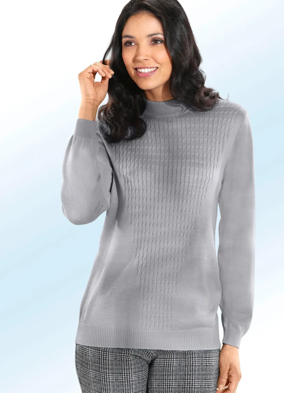 Bezaubernder Pullover mit Stehkragen, V-förmig angeordnetem Zopfmuster im Vorderteil sowie Rippenbundabschlüssen an den langen Ärmeln und am Saum.