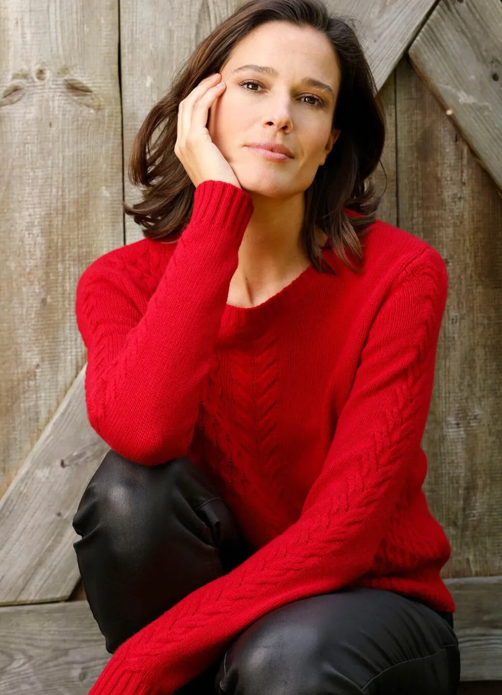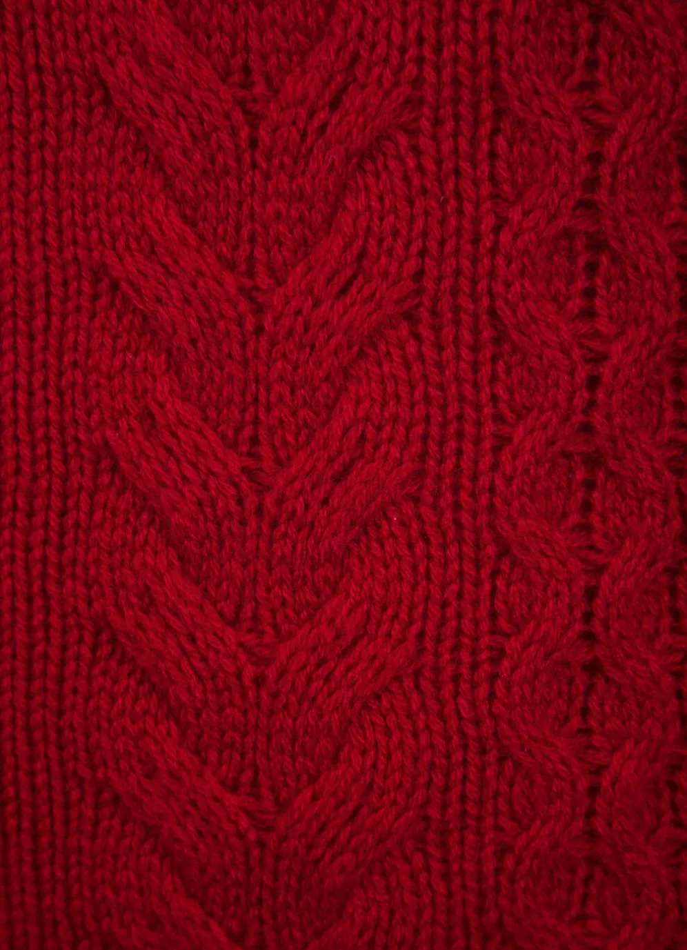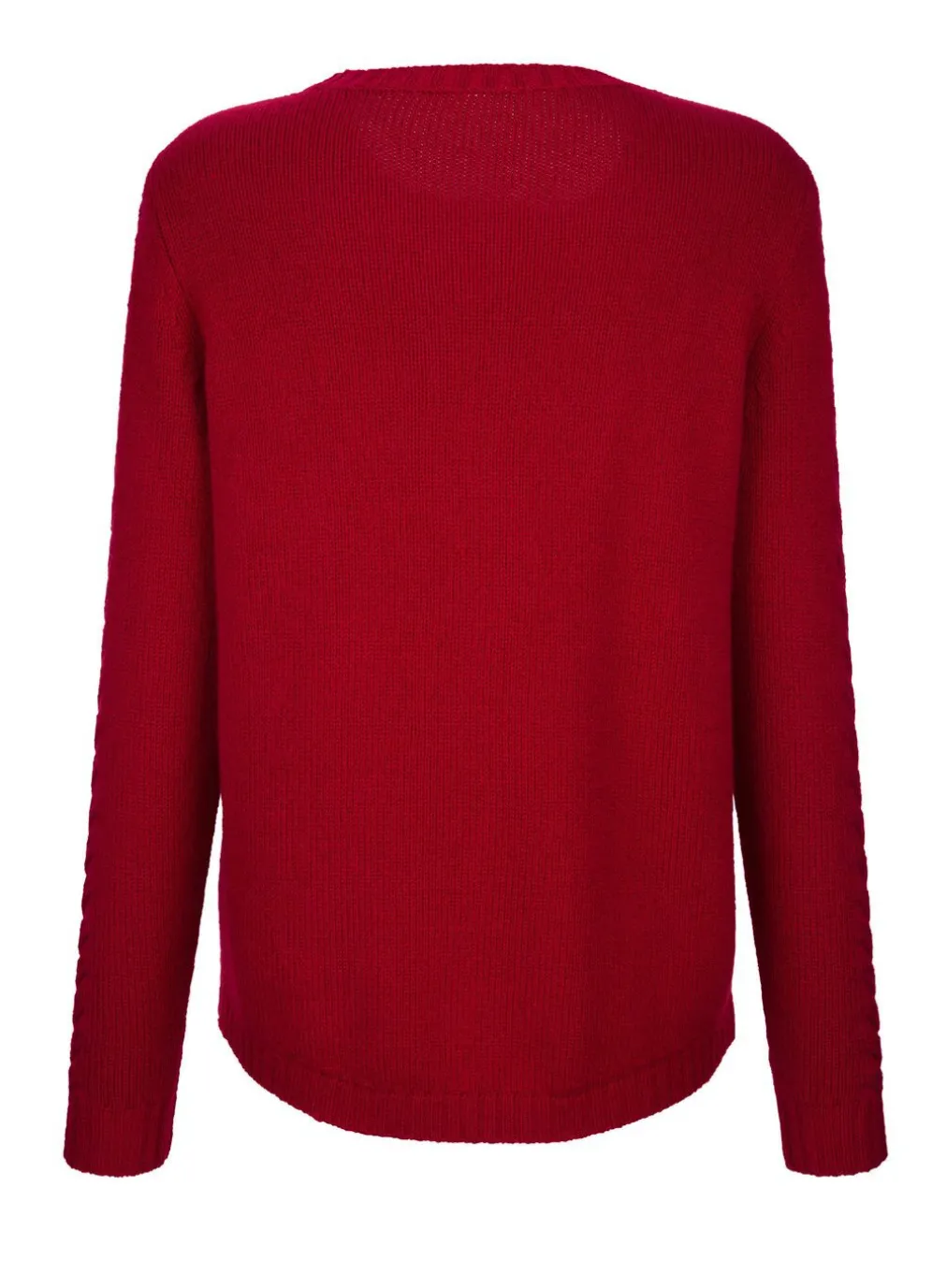 Pullover: runder Halsausschnitt, Rippenabschlüsse, Vorderteil im gepatchtem Strukturmix, Zopfstreifen auf den langen Ärmeln.